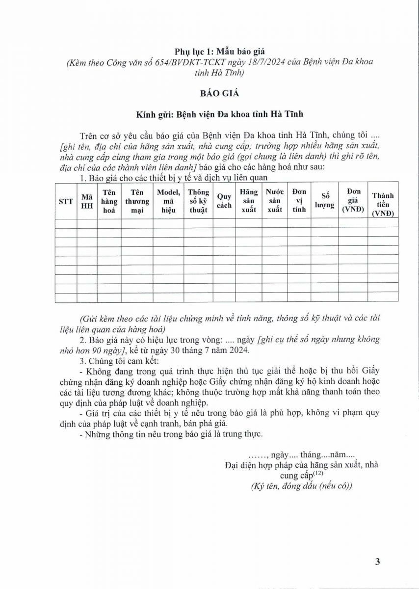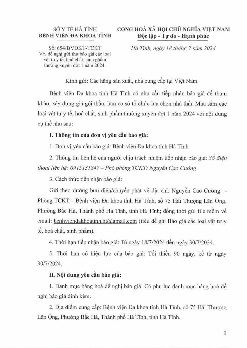 Bệnh viện đa khoa tỉnh Hà Tĩnh có nhu cầu tiếp nhận Báo giá để tham khảo, xây dựng giá gói thầu làm cơ sở tổ chức lựa chọn nhà thầu mua sắm Mua sắm các loại vật tư y tế, hoá chất, sinh phẩm thường xuyên đợt 1 năm 2024 cụ thể như sau: