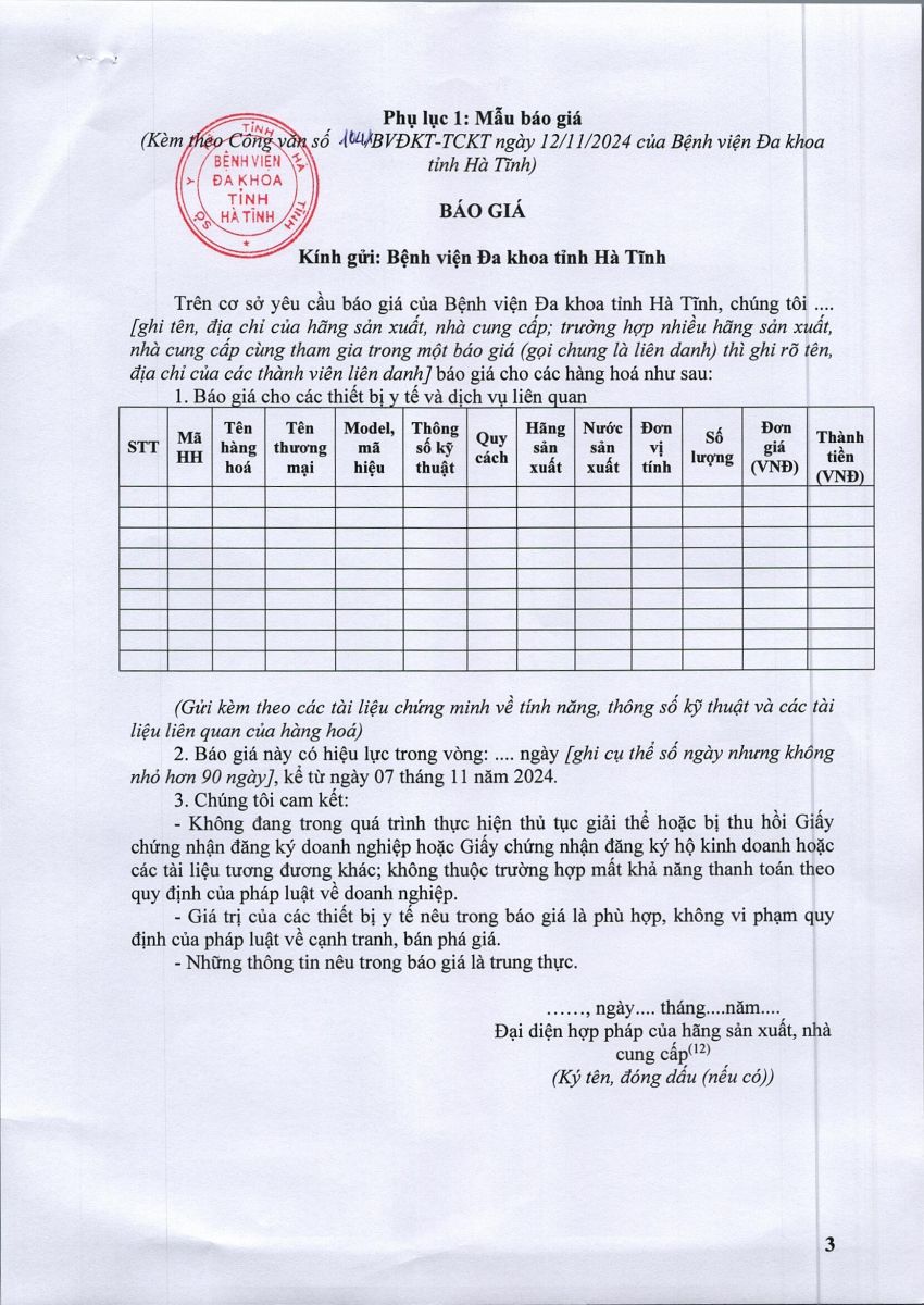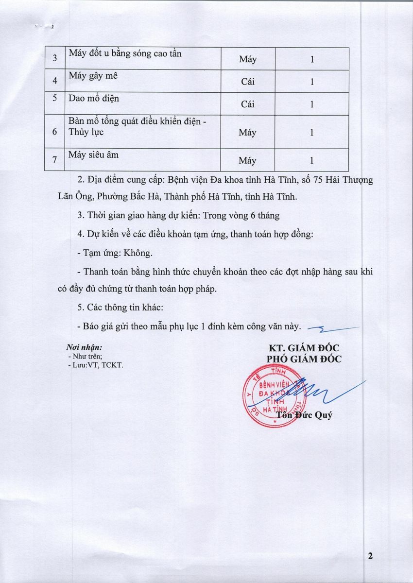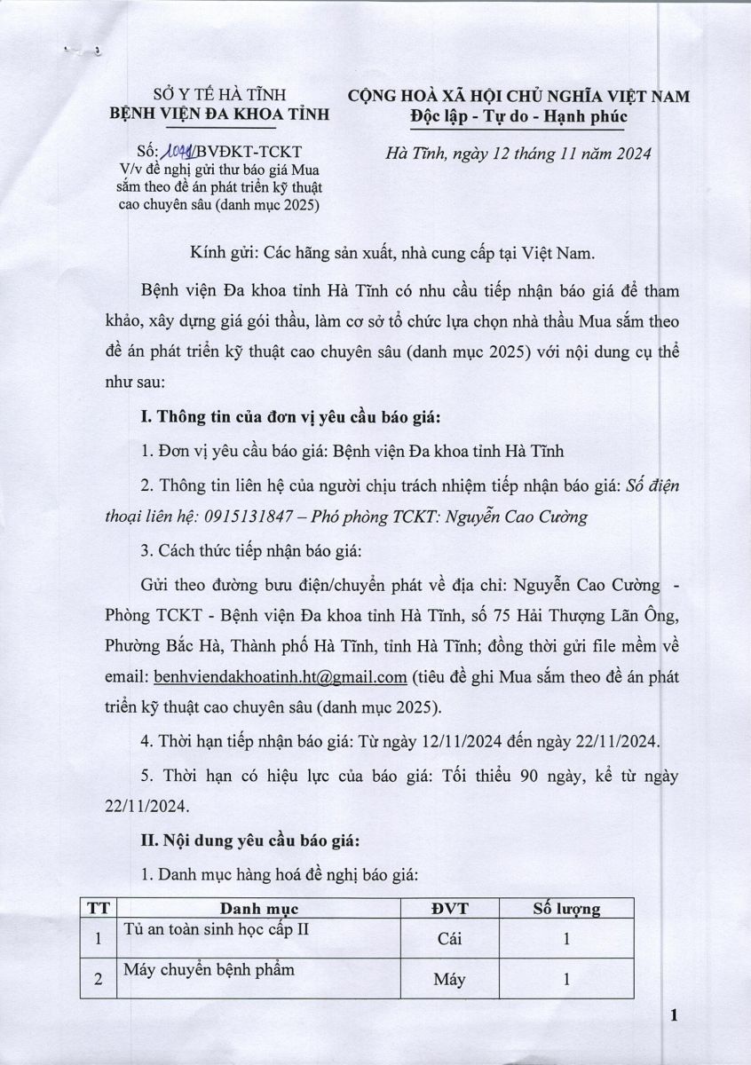 Bệnh viện Đa khoa tỉnh Hà Tĩnh có nhu cầu tiếp nhận báo giá để tham khảo, xây dựng giá gói thầu, làm cơ sở tổ chức lựa chọn nhà thầu Mua sắm theo đề án phát triển kỹ thuật cao chuyên sâu (danh mục 2025) với nội dung cụ thể như sau: