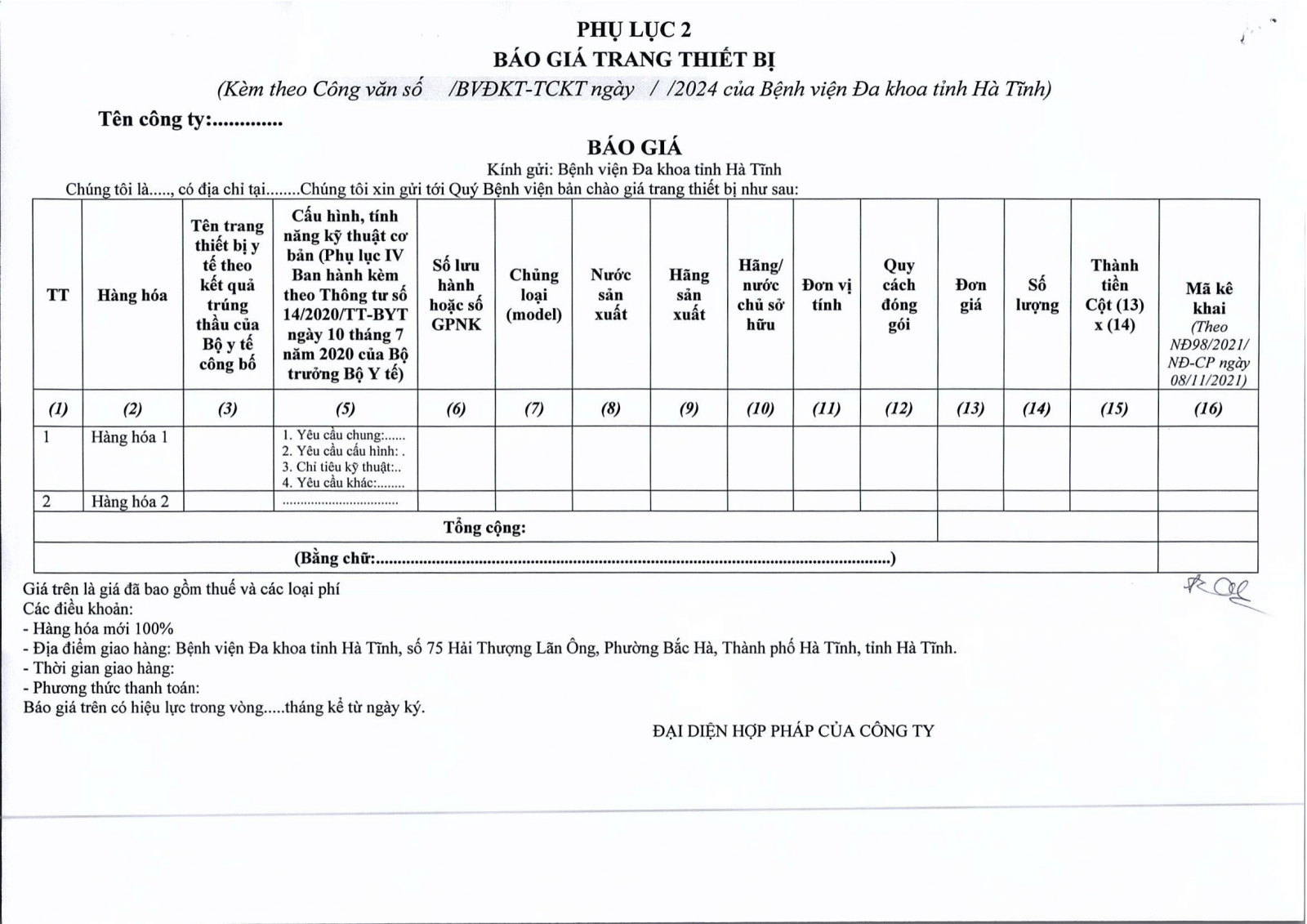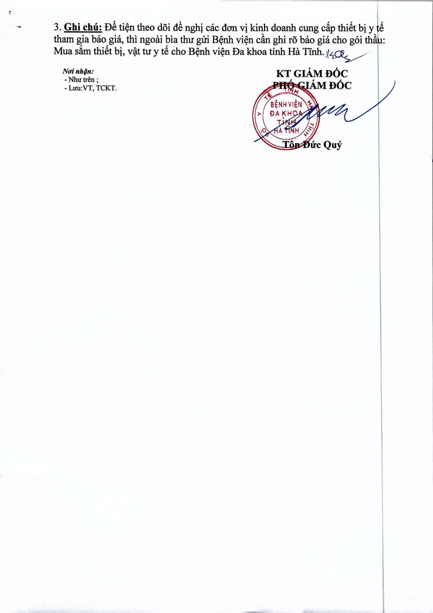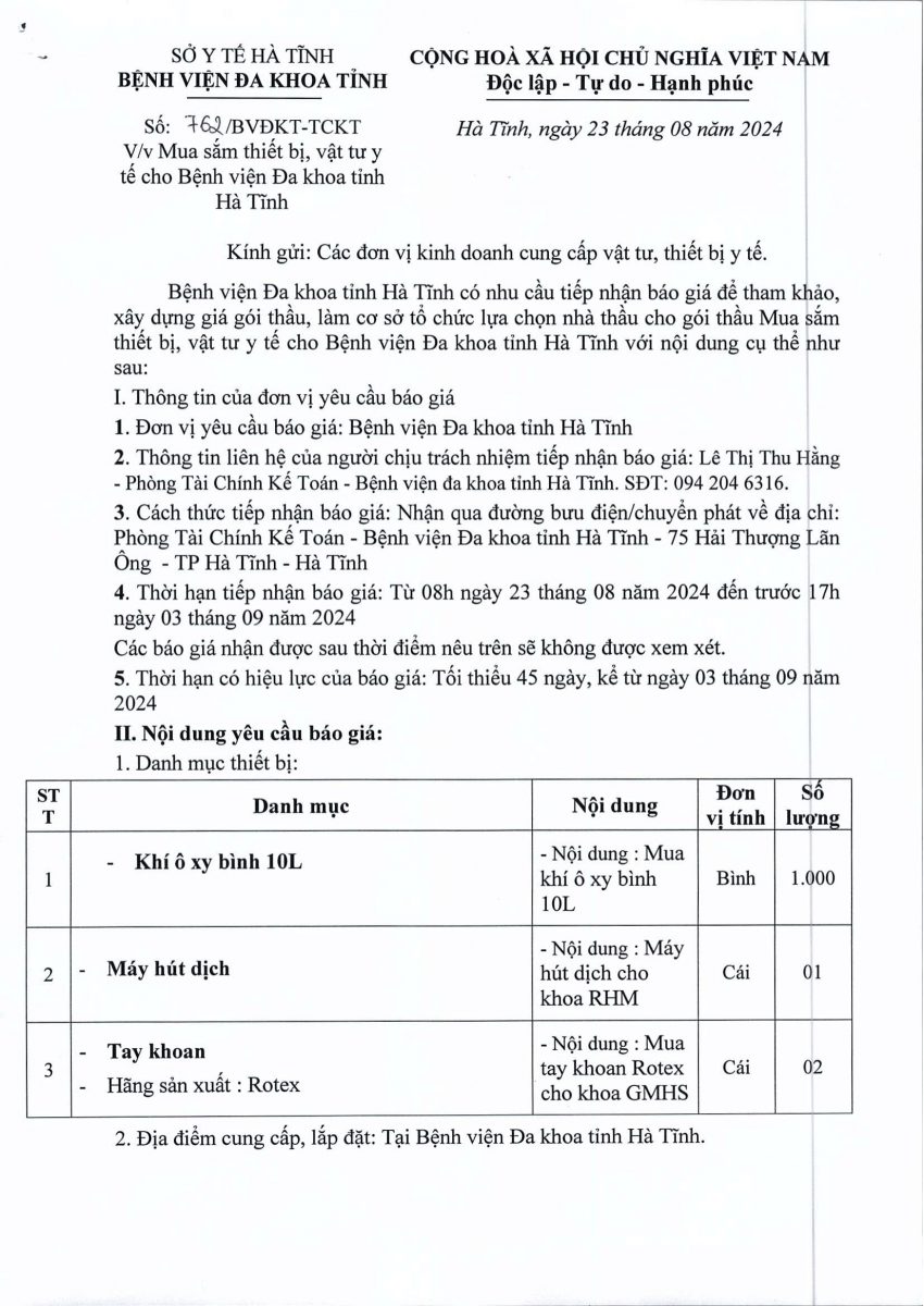 BVĐKT: Thông báo gửi thư báo giá Mua sắm thiết bị, vật tư y tế cho Bệnh viện Đa khoa tỉnh Hà Tĩnh