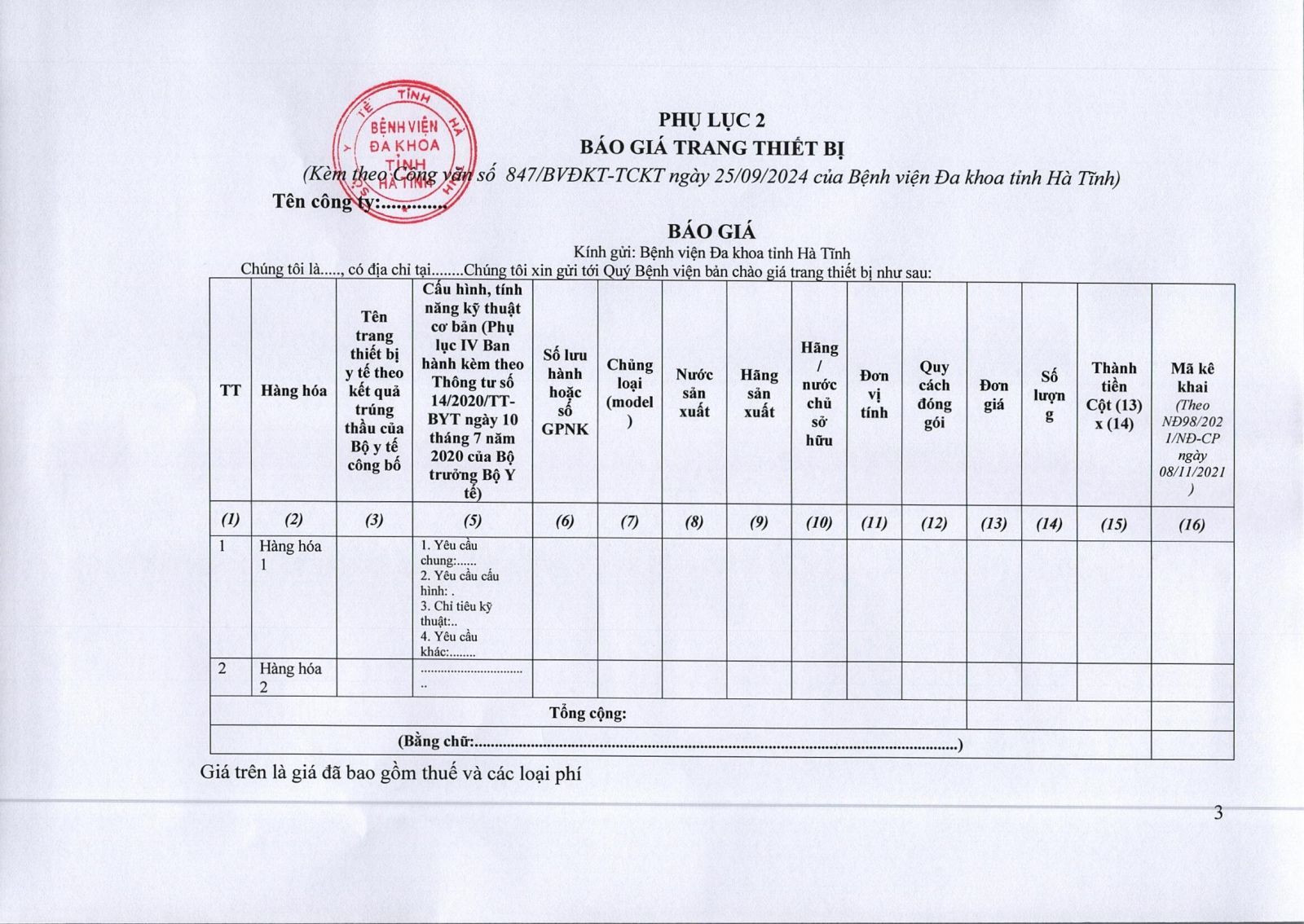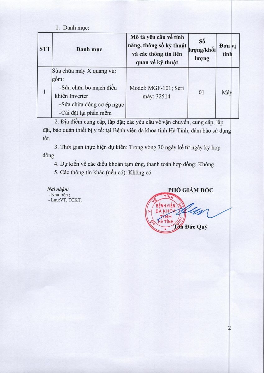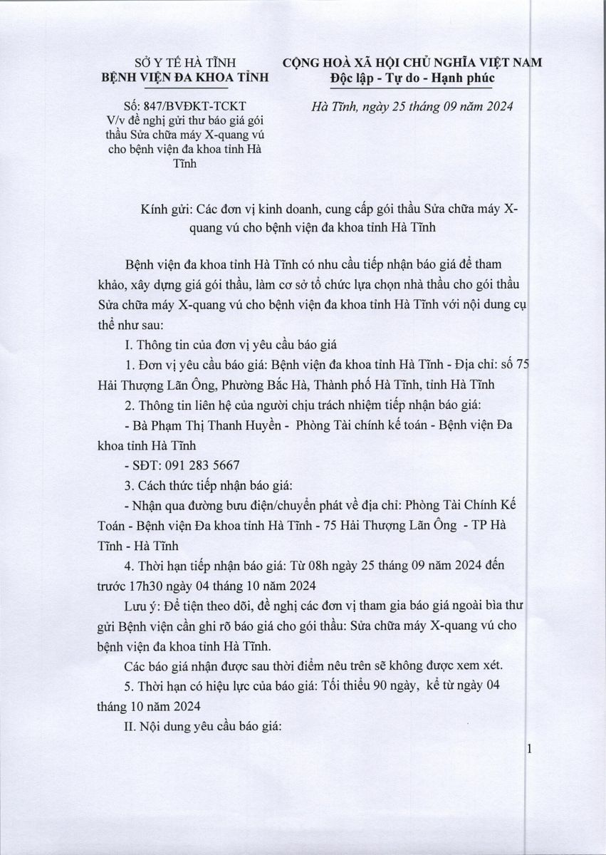Bệnh viện đa khoa tỉnh Hà Tĩnh có nhu cầu tiếp nhận báo giá để tham khảo, xây dựng giá gói thầu, làm cơ sở tổ chức lựa chọn nhà thầu cho gói thầu Sửa chữa máy X-quang vú cho bệnh viện đa khoa tỉnh Hà Tĩnh với nội dung cụ thể như sau: