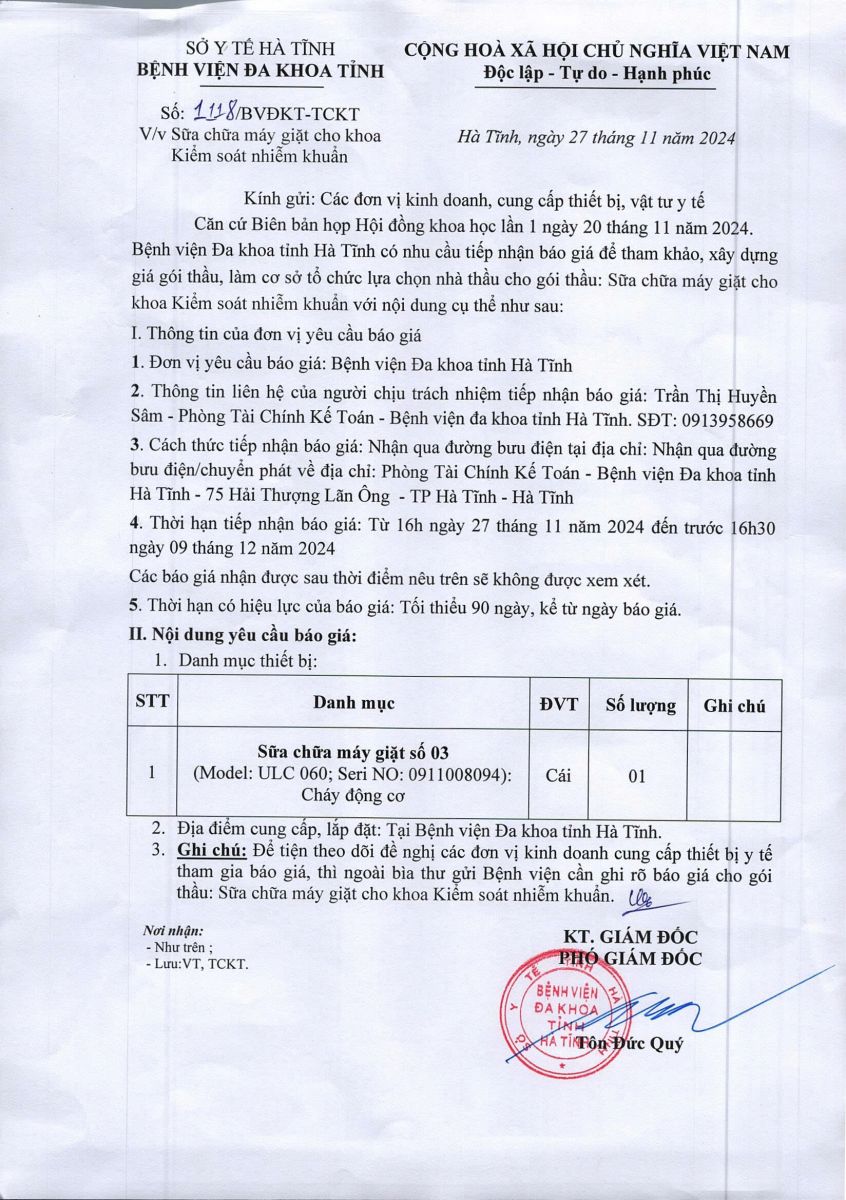 Căn cứ Biên bản họp Hội đồng khoa học lần 1 ngày 20 tháng 11 năm 2024. Bệnh viện Đa khoa tỉnh Hà Tĩnh có nhu cầu tiếp nhận báo giá để tham khảo, xây dựng giá gói thầu, làm cơ sở tổ chức lựa chọn nhà thầu cho gói thầu: Sữa chữa máy giặt cho khoa Kiểm soát nhiễm khuẩn với nội dung cụ thể như sau: