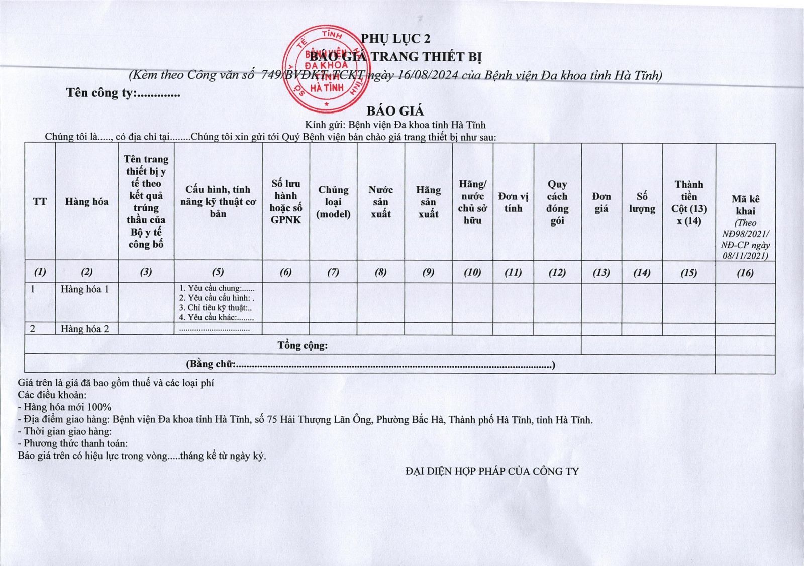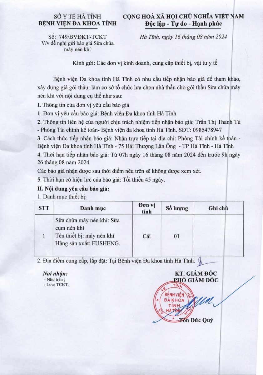 Bệnh viện Đa khoa tỉnh Hà Tĩnh có nhu cầu tiếp nhận báo giá để tham khảo, xây dựng giá gói thầu, làm cơ sở tổ chức lựa chọn nhà thầu cho gói thầu Sữa chữa máy nén khí với nội dung cụ thể như sau: