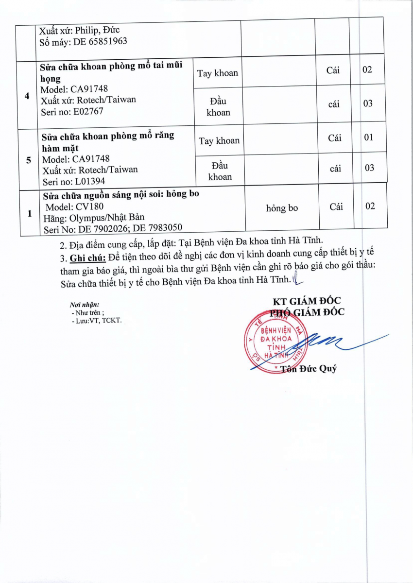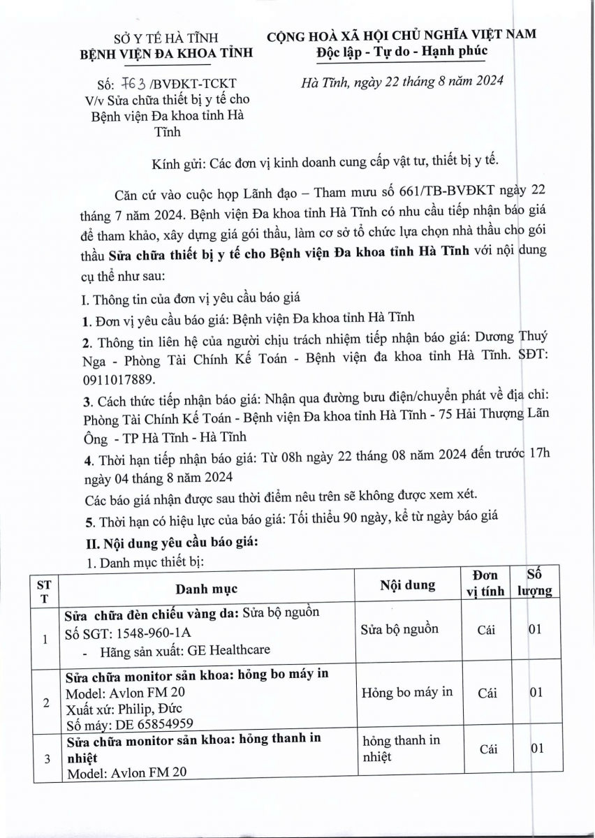 BVĐKT: Thông báo gửi thư báo giá Sửa chữa thiết bị y tế cho Bệnh viện Đa khoa tỉnh Hà Tĩnh