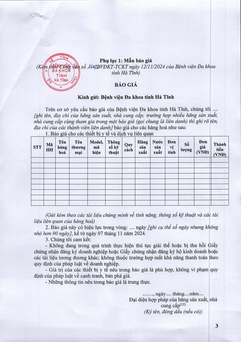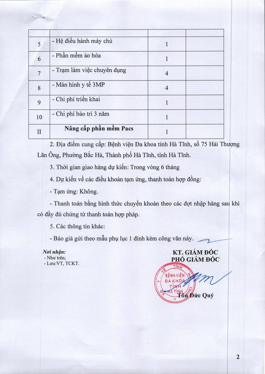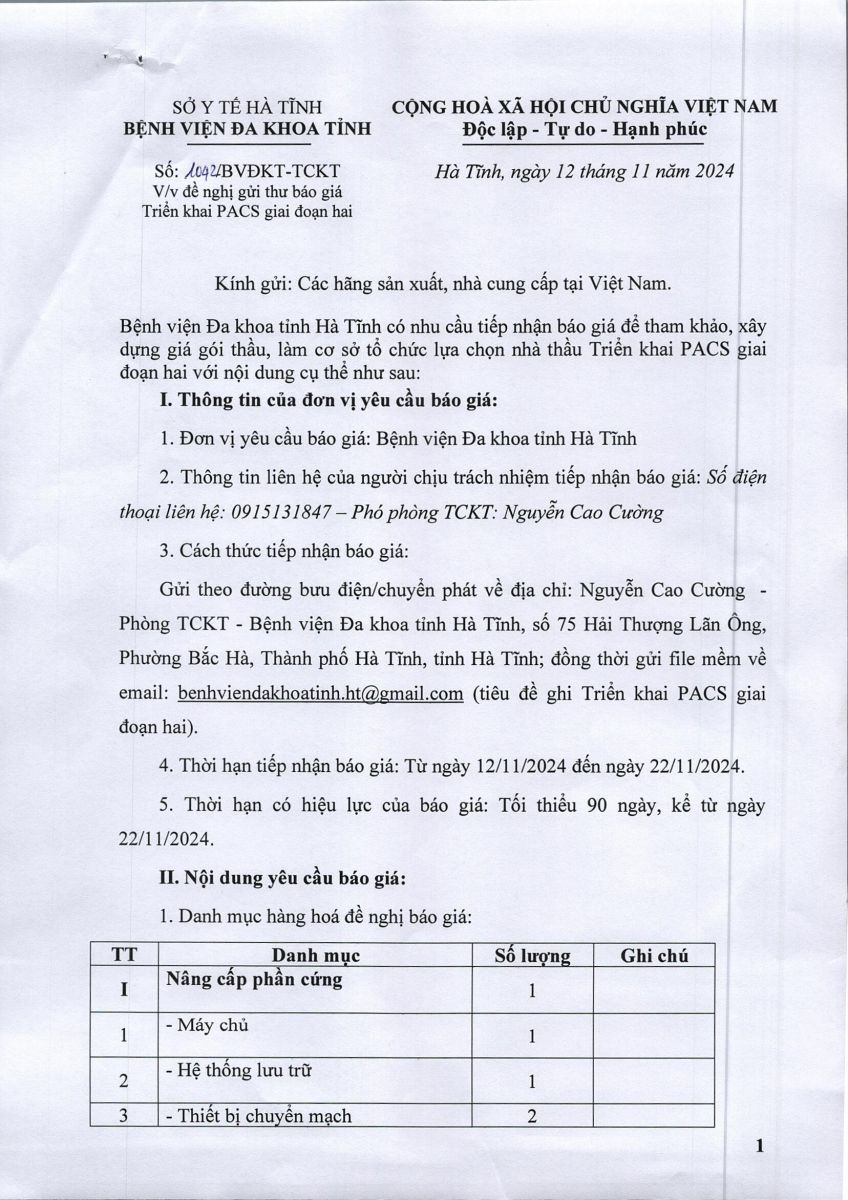 Bệnh viện Đa khoa tỉnh Hà Tĩnh có nhu cầu tiếp nhận báo giá để tham khảo, xây dựng giá gói thầu, làm cơ sở tổ chức lựa chọn nhà thầu Triển khai PACS giai đoạn hai với nội dung cụ thể như sau: