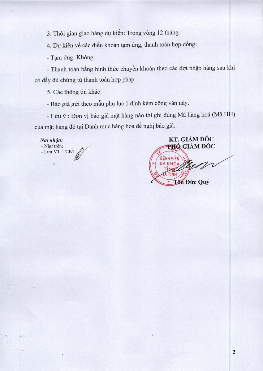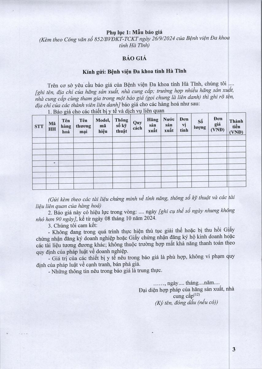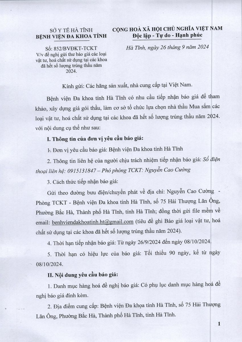 Bệnh viện Đa khoa tỉnh Hà Tĩnh có nhu cầu tiếp nhận báo giá để tham khảo, xây dựng giá gói thầu, làm cơ sở tổ chức lựa chọn nhà thầu Mua sắm các loại vật tư, hoá chất sử dụng tại các khoa đã hết số lượng trúng thầu năm 2024. với nội dung cụ thể như sau:
