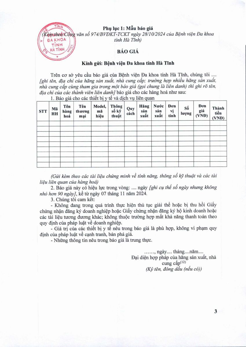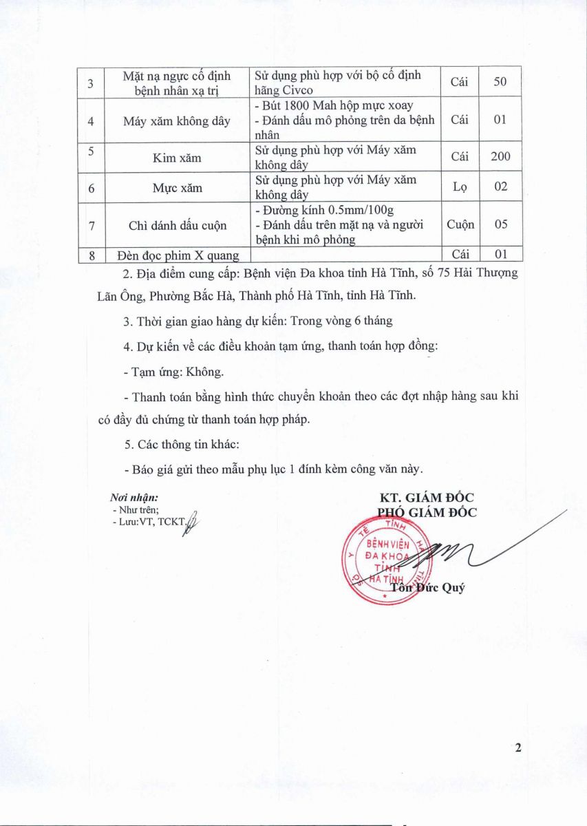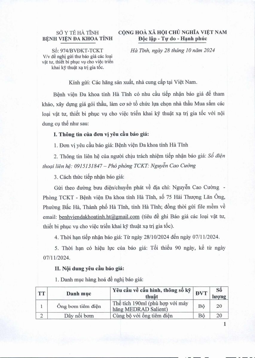 Bệnh viện Đa khoa tỉnh Hà Tĩnh có nhu cầu tiếp nhận báo giá để tham khảo, xây dựng giá gói thầu, làm cơ sở tổ chức lựa chọn nhà thầu Mua sắm các loại vật tư, thiết bi phục vụ cho việc triển khai kỹ thuật xạ trị gia tốc với nội dung cụ thể như sau: