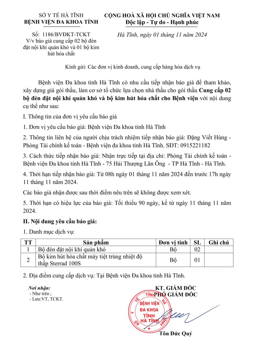 Bệnh viện Đa khoa tỉnh Hà Tĩnh có nhu cầu tiếp nhận báo giá để tham khảo, xây dựng giá gói thầu, làm cơ sở tổ chức lựa chọn nhà thầu cho gói thầu Cung cấp 02 bộ đèn đặt nội khí quản khó và bộ kim hút hóa chất cho Bệnh viện với nội dung cụ thể như sau: