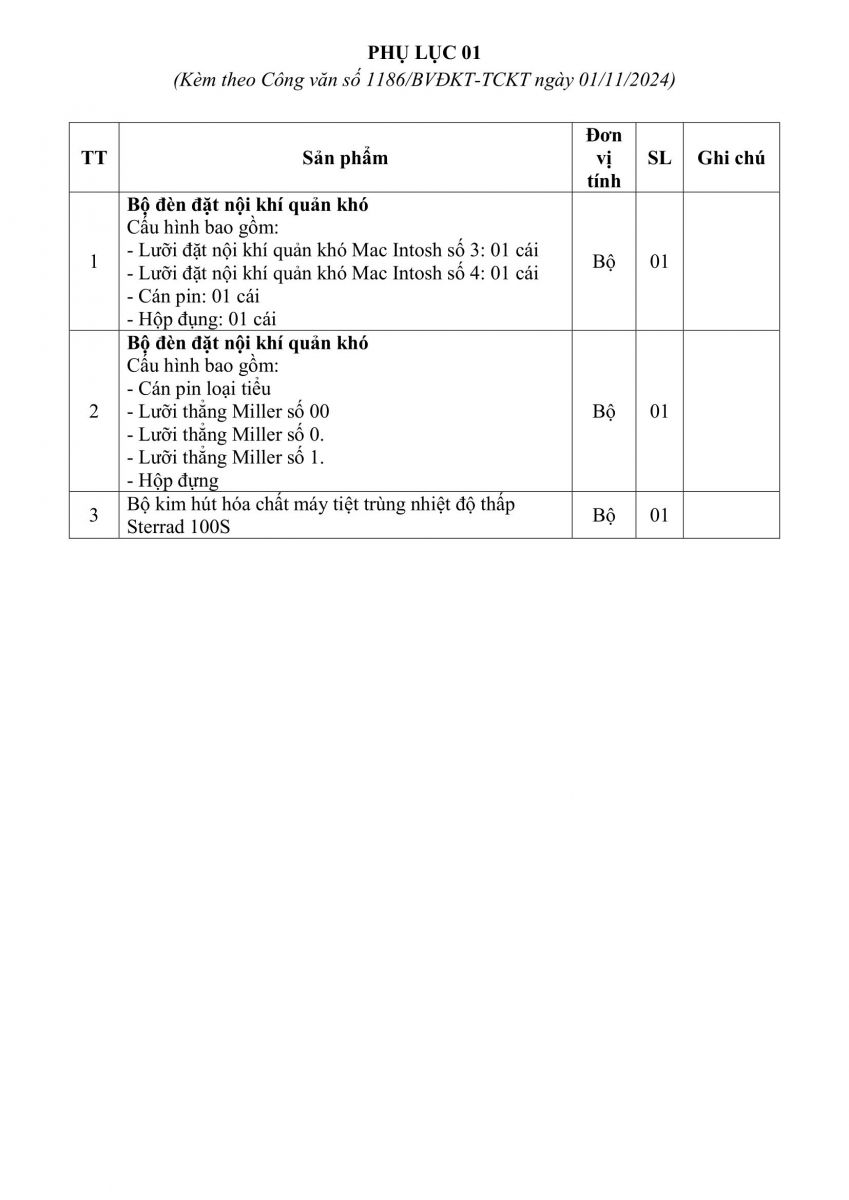 BVĐKT: Thông báo gửi thư báo giá cung cấp 02 bộ đèn đặt nội khí quản khó và 01 bộ kim hút hóa chất