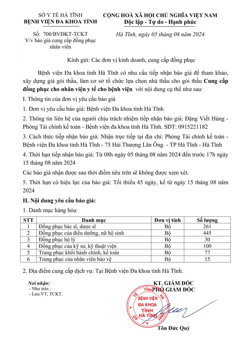 Bệnh viện Đa khoa tỉnh Hà Tĩnh có nhu cầu tiếp nhận báo giá để tham khảo, xây dựng giá gói thầu, làm cơ sở tổ chức lựa chọn nhà thầu cho gói thầu Cung cấp đồng phục cho nhân viện y tế cho bệnh viện với nội dung cụ thể như sau: