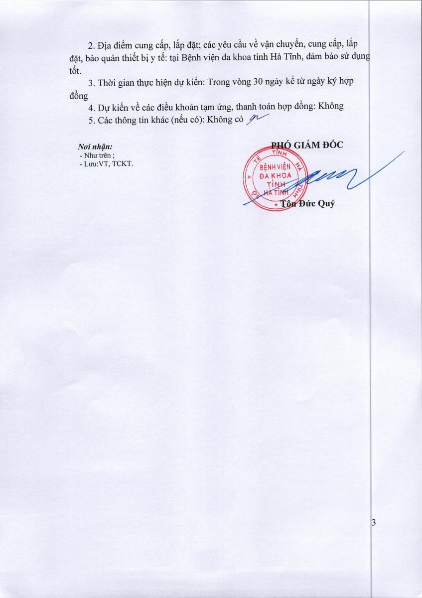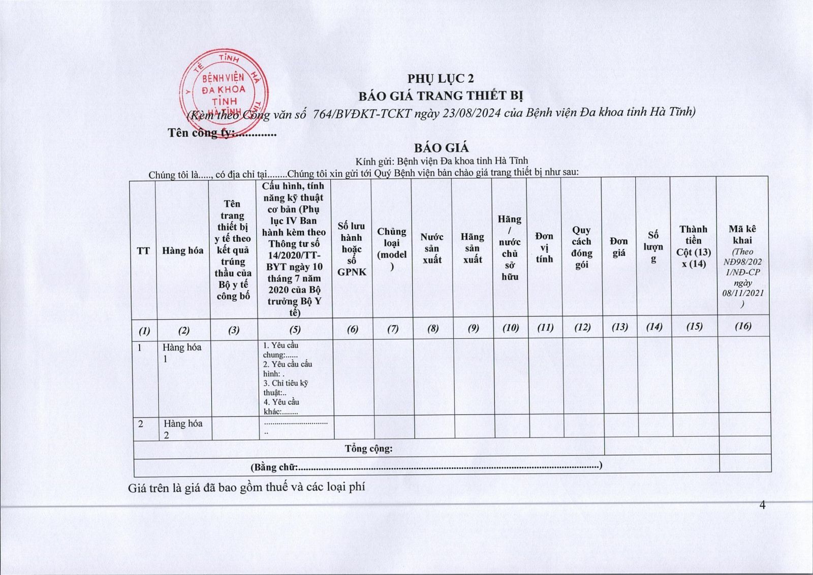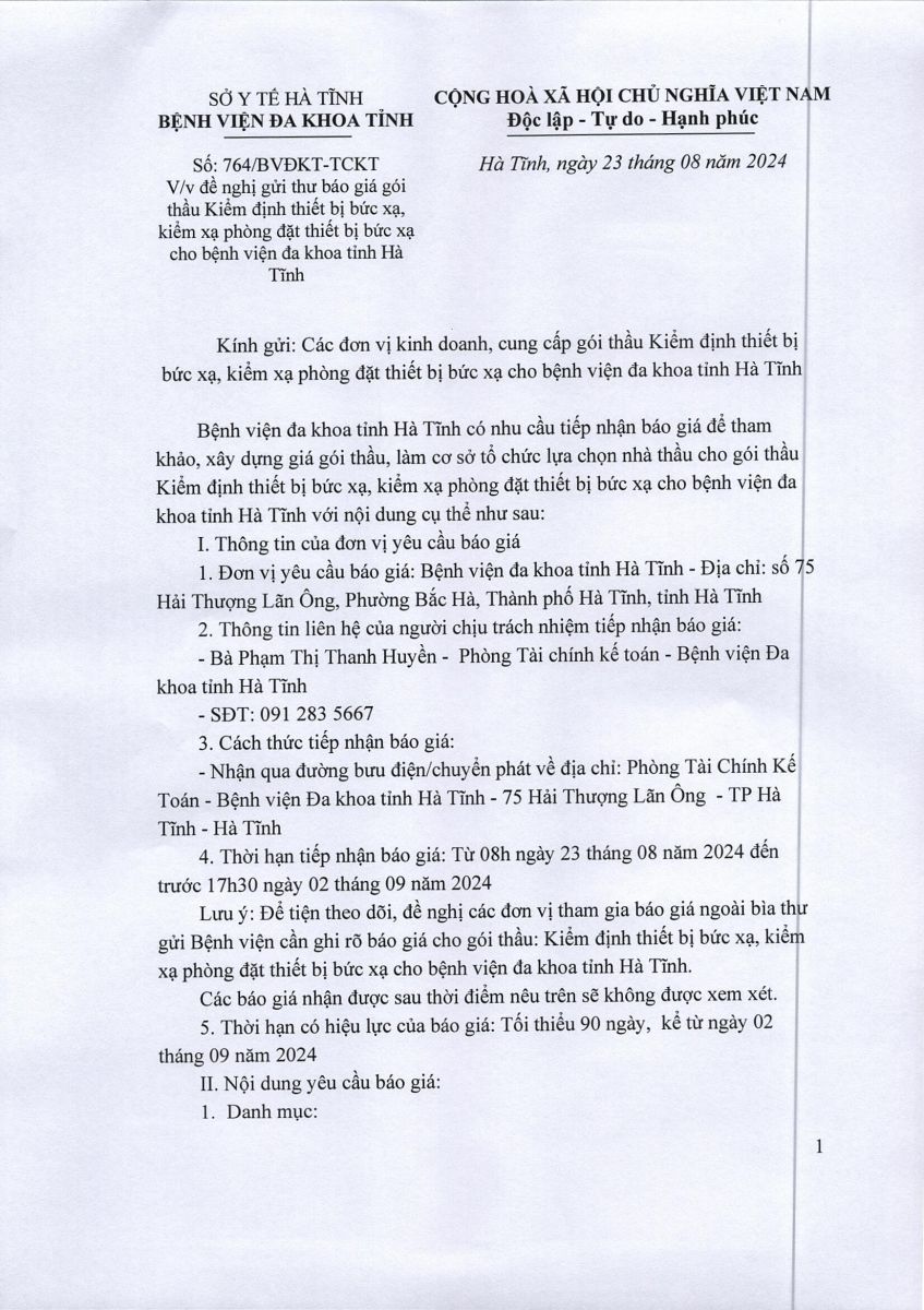 Bệnh viện Đa khoa tỉnh Hà Tĩnh có nhu cầu tiếp nhận báo giá để tham khảo, xây dựng giá gói thầu, làm cơ sở tổ chức lựa chọn nhà thầu cho gói thầu Kiểm định thiết bị bức xạ, kiểm xạ phòng đặt thiết bị bức xạ cho Bệnh viện Đa khoa tỉnh Hà Tĩnh với nội dung cụ thể như sau: