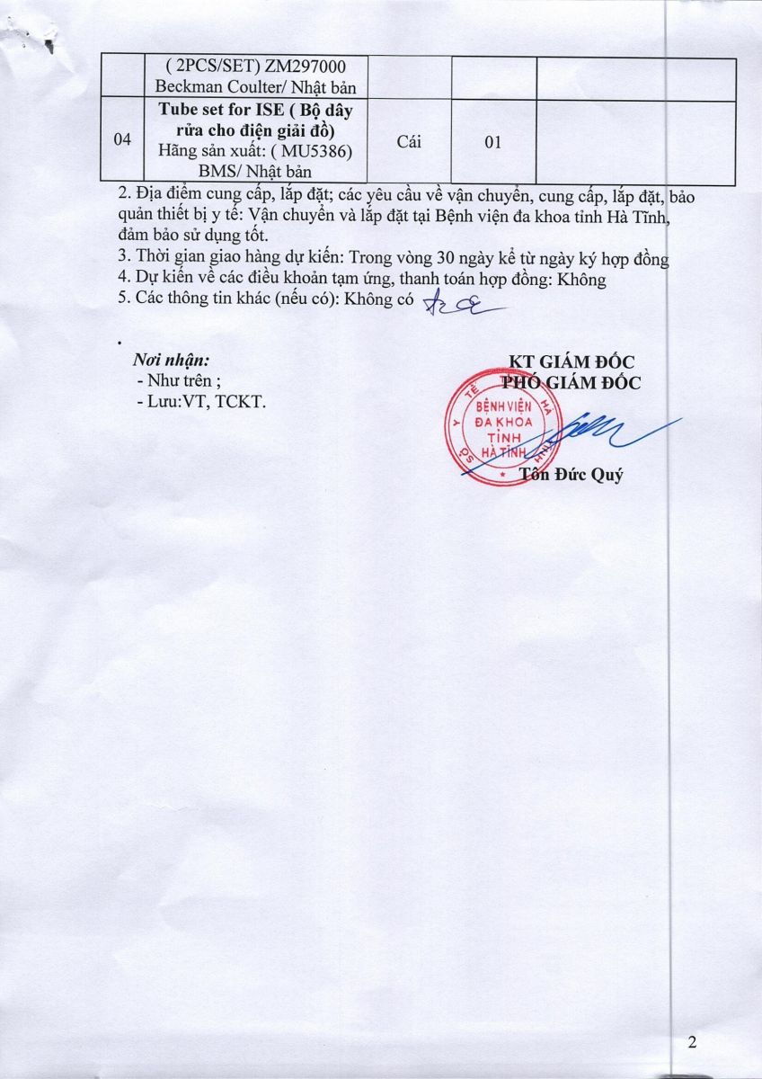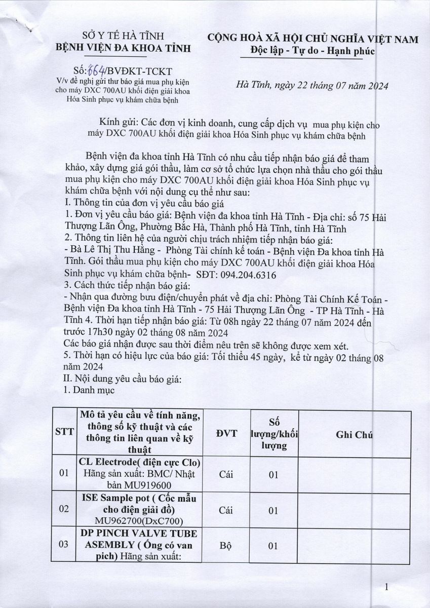 Bệnh viện đa khoa tỉnh Hà Tĩnh có nhu cầu tiếp nhận báo giá để tham khảo, xây dựng giá gói thầu, làm cơ sở tổ chức lựa chọn nhà thầu cho gói thầu mua phụ kiện cho máy DXC 700AU khối điện giải khoa Hóa Sinh phục vụ khám chữa bệnh với nội dung cụ thể như sau:
