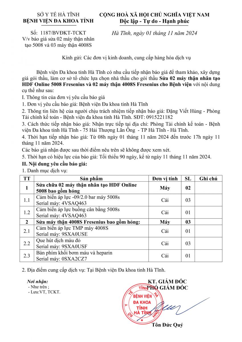 Bệnh viện Đa khoa tỉnh Hà Tĩnh có nhu cầu tiếp nhận báo giá để tham khảo, xây dựng giá gói thầu, làm cơ sở tổ chức lựa chọn nhà thầu cho gói thầu Sửa 02 máy thận nhân tạo HDF Online 5008 Fresenius và 02 máy thận 4008S Fresenius cho Bệnh viện với nội dung cụ thể như sau: