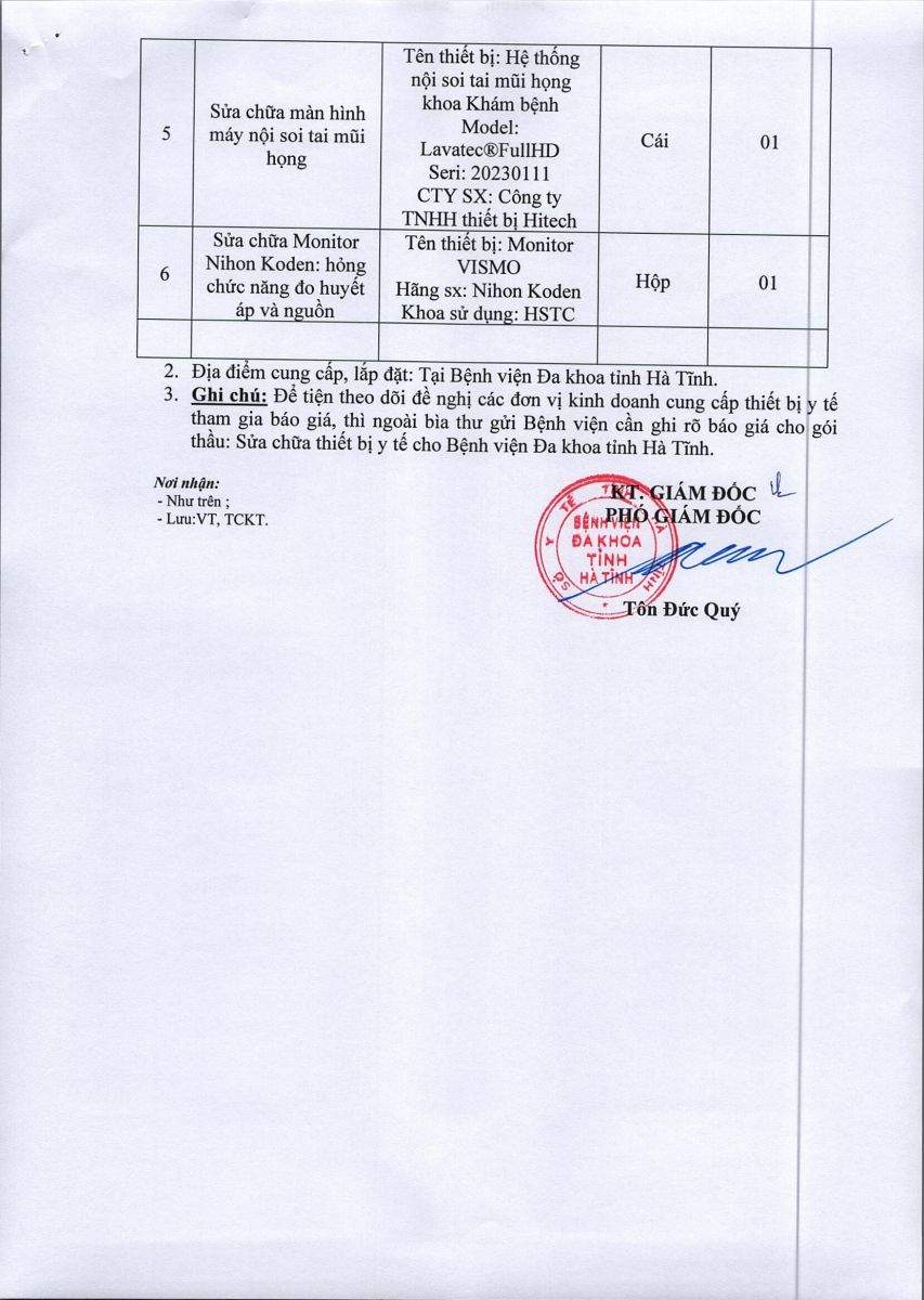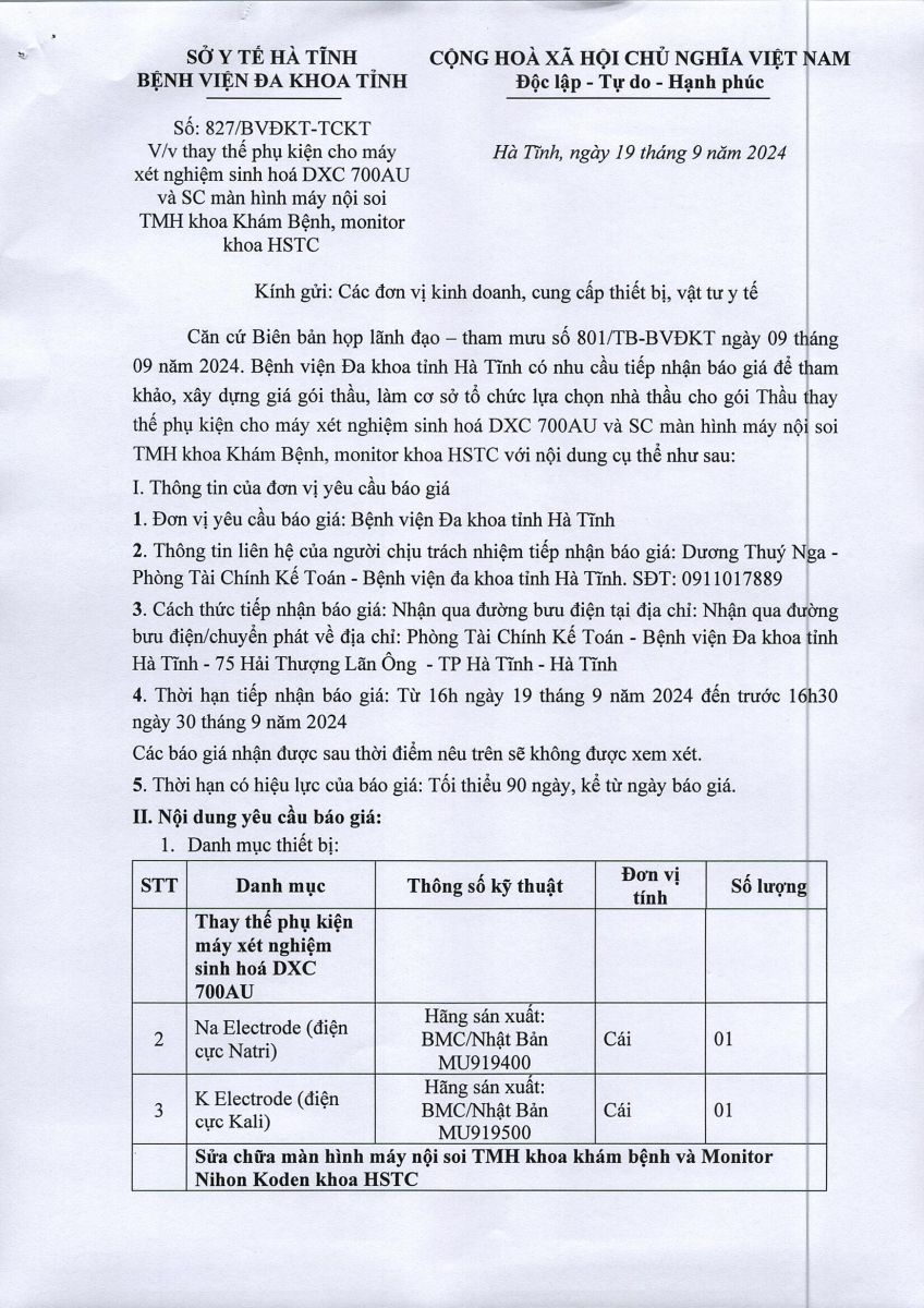 Căn cứ Biên bản họp lãnh đạo – tham mưu số 801/TB-BVĐKT ngày 09 tháng 09 năm 2024. Bệnh viện Đa khoa tỉnh Hà Tĩnh có nhu cầu tiếp nhận báo giá để tham khảo, xây dựng giá gói thầu, làm cơ sở tổ chức lựa chọn nhà thầu cho gói Thầu thay thế phụ kiện cho máy xét nghiệm sinh hoá DXC 700AU và SC màn hình máy nội soi TMH khoa Khám Bệnh, monitor khoa HSTC với nội dung cụ thể như sau: