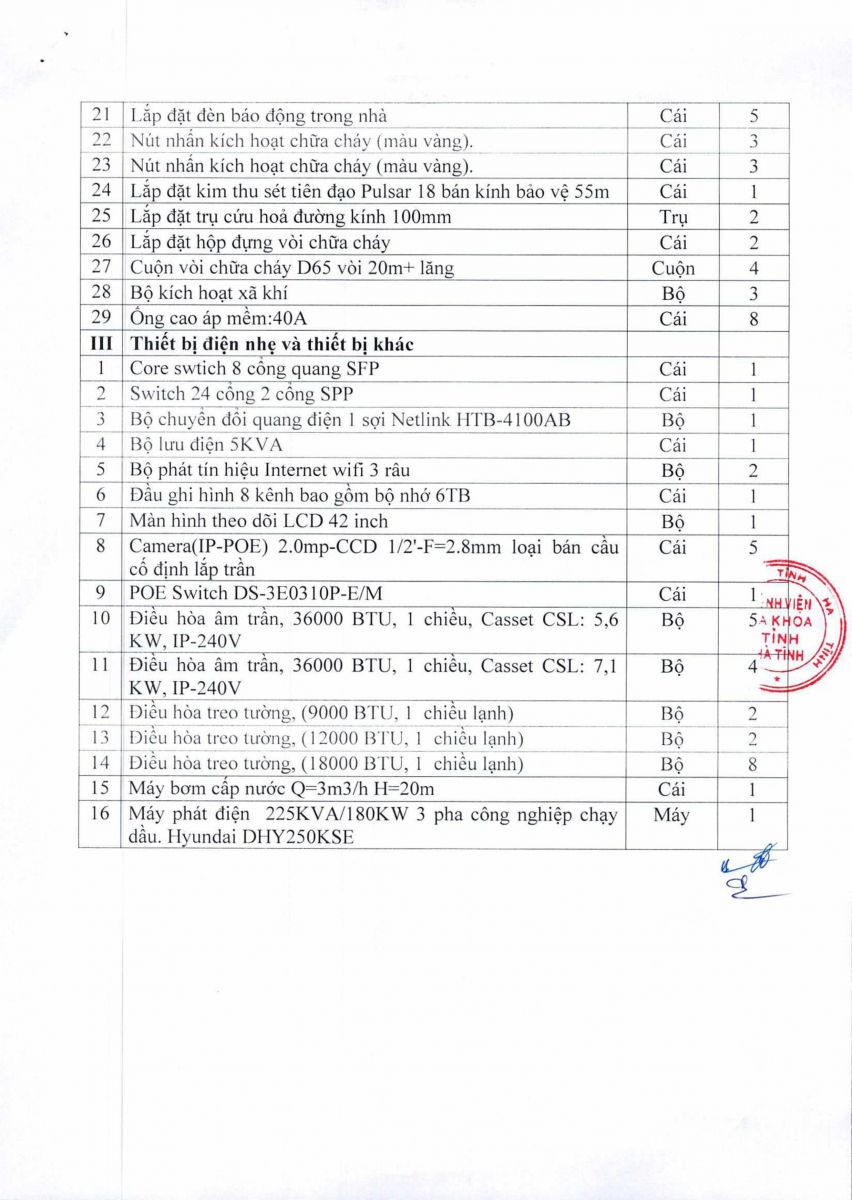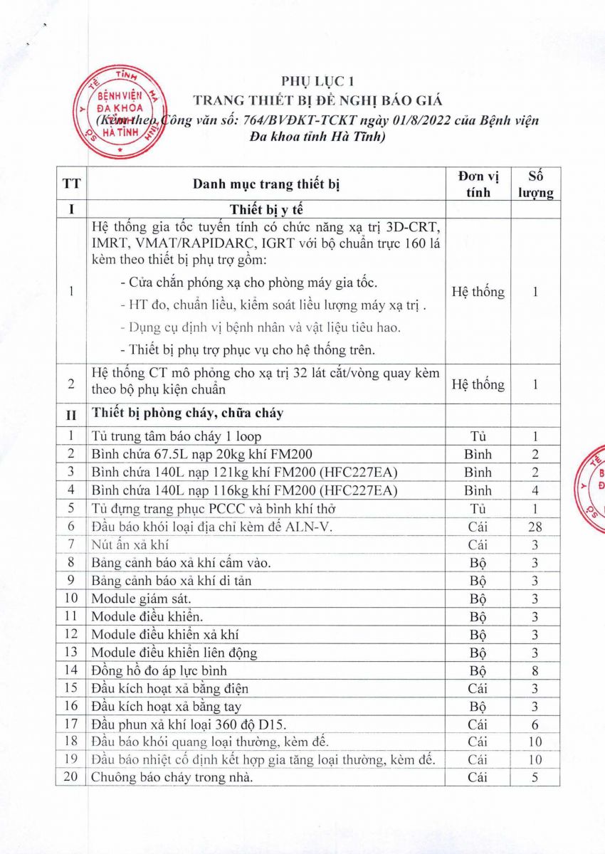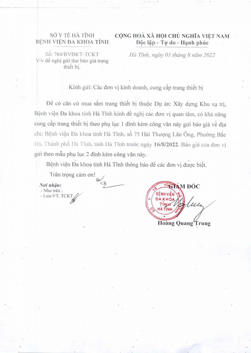 BVĐK Tỉnh: Thông báo gửi thư báo giá các trang thiết bị tháng 08/2022