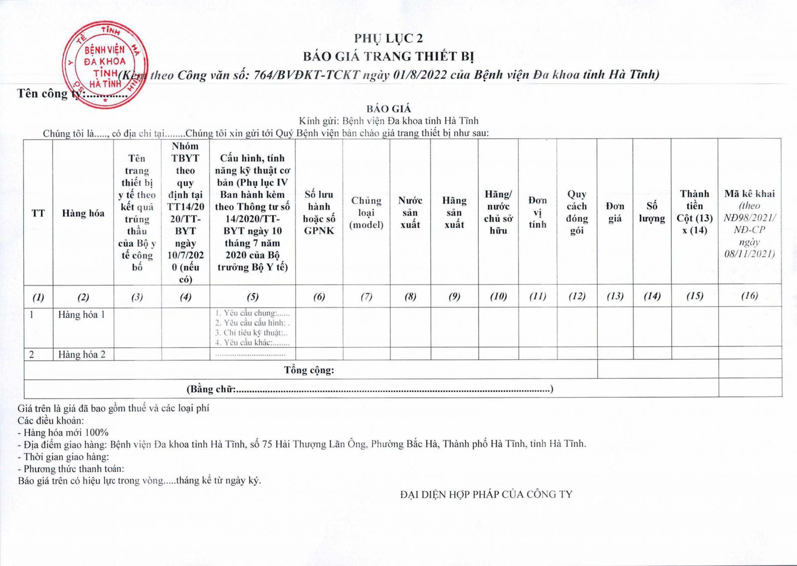 Kính đề nghị các đơn vị quan tâm, có khả năng cung cấp trang thiết bị theo danh sách gửi báo giá về địa chỉ: Bệnh viện Đa khoa tỉnh Hà Tĩnh, Số 75, đường Hải Thượng Lãn Ông, phường Bắc Hà, thành phố Hà Tĩnh, tỉnh Hà Tĩnh trước ngày 16/08/2022.