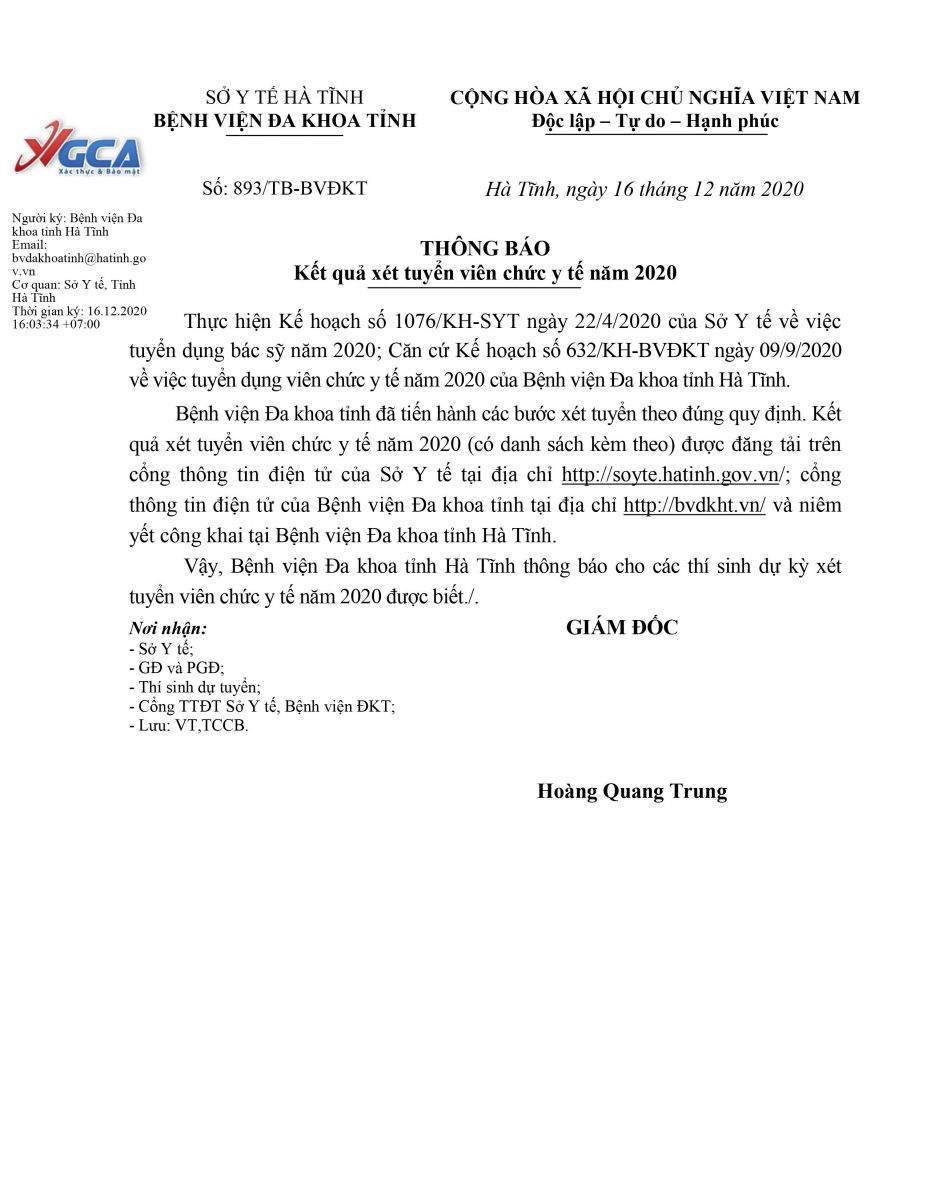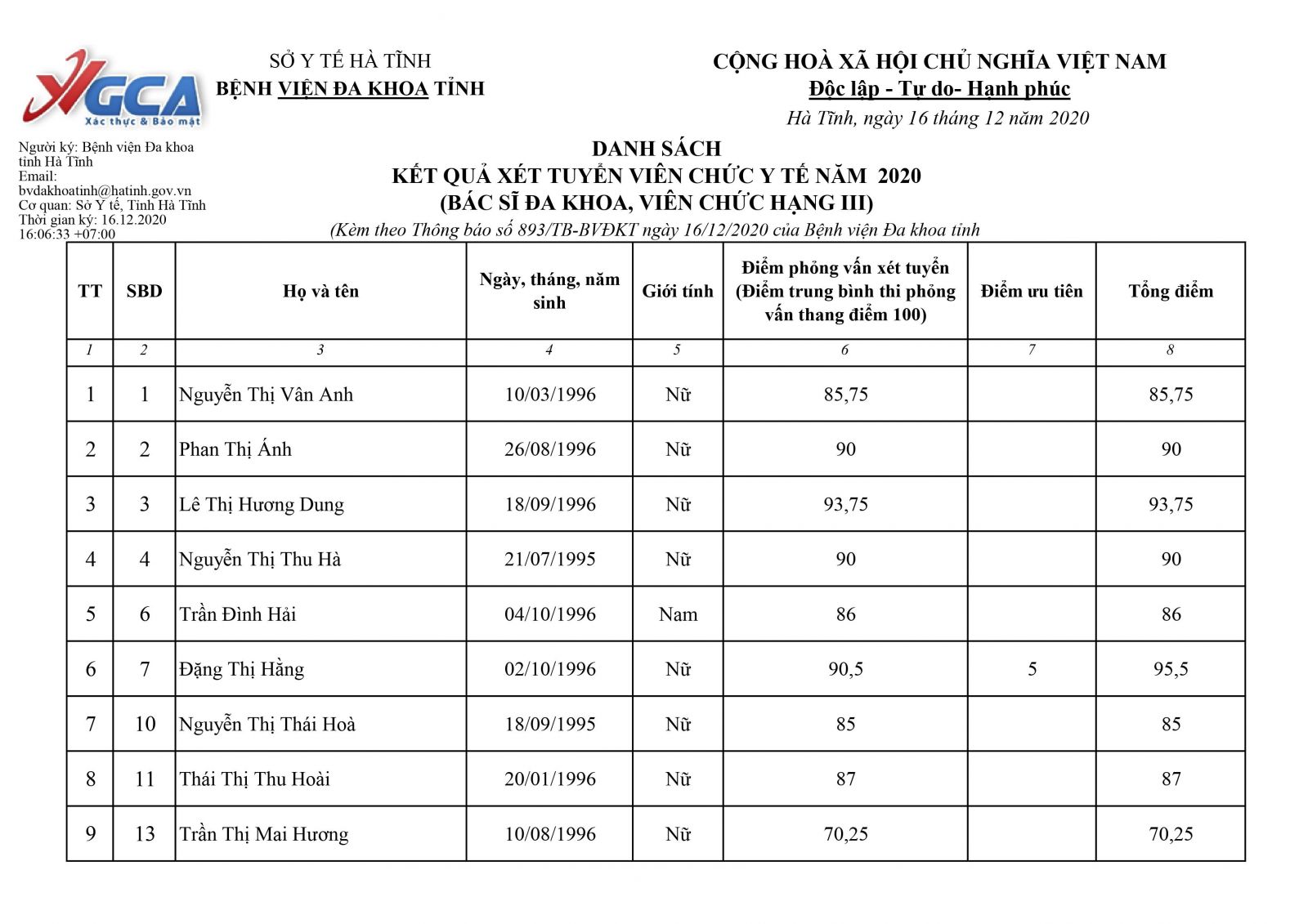 Thực hiện Kế hoạch số 1076/KH-SYT ngày 22/4/2020 của Sở Y tế về việc tuyển dụng bác sỹ năm 2020; Căn cứ Kế hoạch số 632/KH-BVĐKT ngày 09/9/2020 về việc tuyển dụng viên chức y tế năm 2020 của Bệnh viện Đa khoa tỉnh Hà Tĩnh. Bệnh viện Đa khoa tỉnh đã tiến hành các bước xét tuyển theo đúng quy định. Kết quả cụ thể như sau: