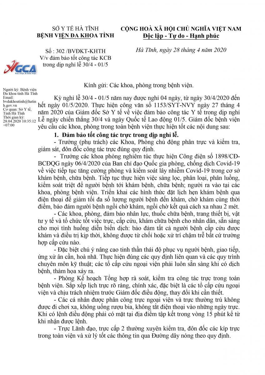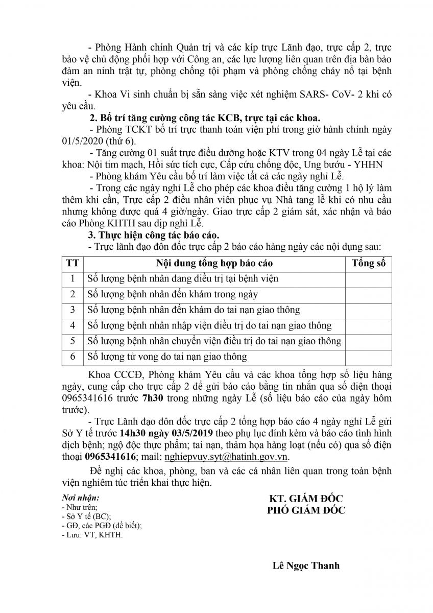Ngày 28/4/2020, Giám đốc bệnh viện ban hành văn bản số 302/BVĐKT - KHTH yêu cầu các khoa, phòng trong toàn bệnh viện thực hiện tốt các nội dung nhằm đảm bảo tốt công tác trực trong dịp nghỉ lễ, cụ thể như sau: