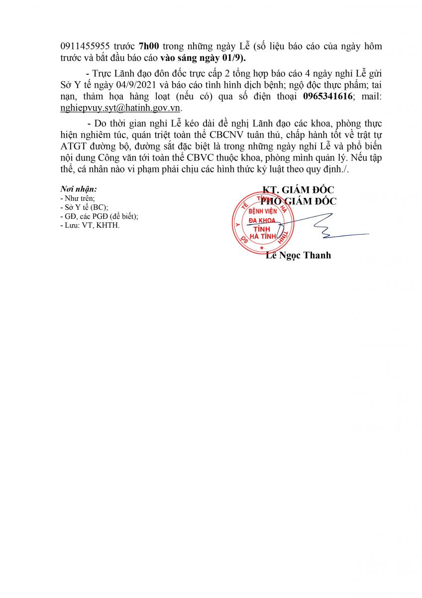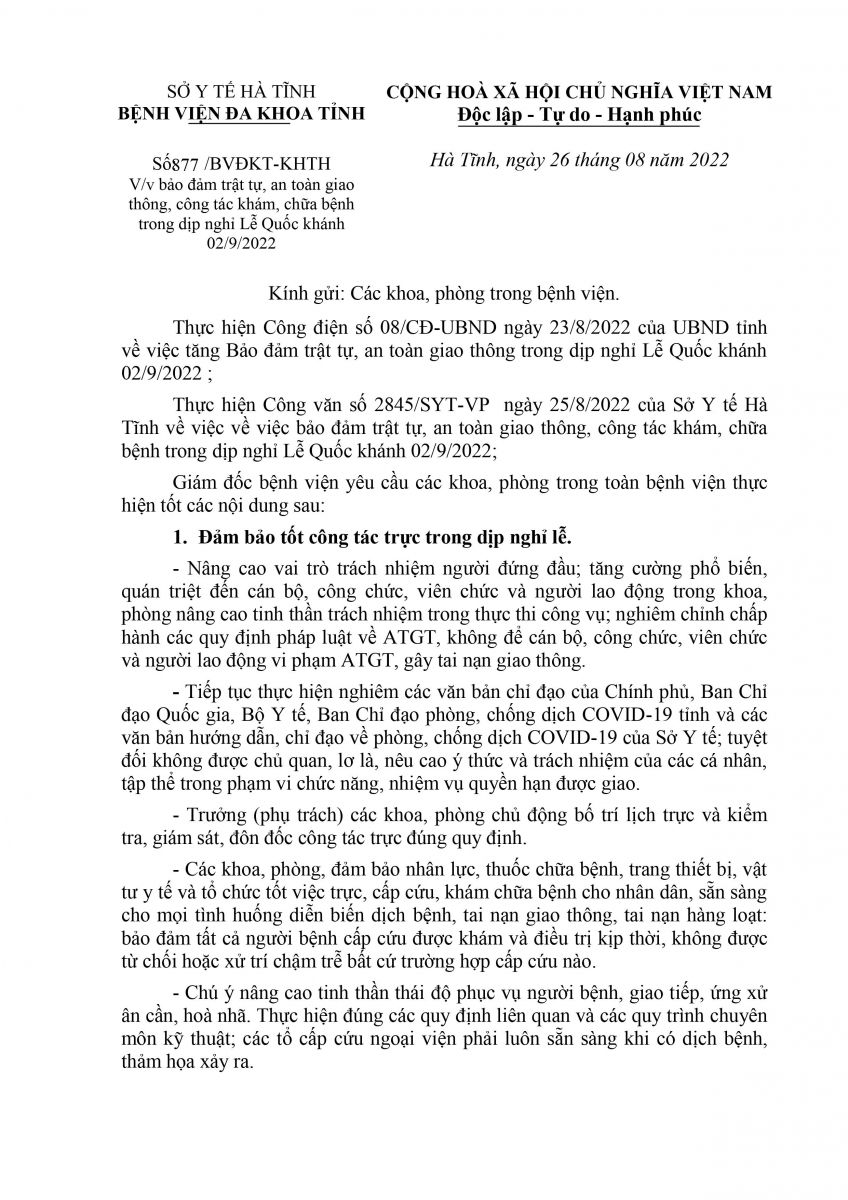 Bệnh viện Đa khoa tỉnh Hà Tĩnh vừa ban hành công văn số 877/BVĐKT-KHTH, ngày 26/08/2022 về việc đảm bảo trật tự, an toàn giao thông, công tác khám, chữa bệnh trong dịp nghỉ Lễ Quốc khánh 02/09/2022.