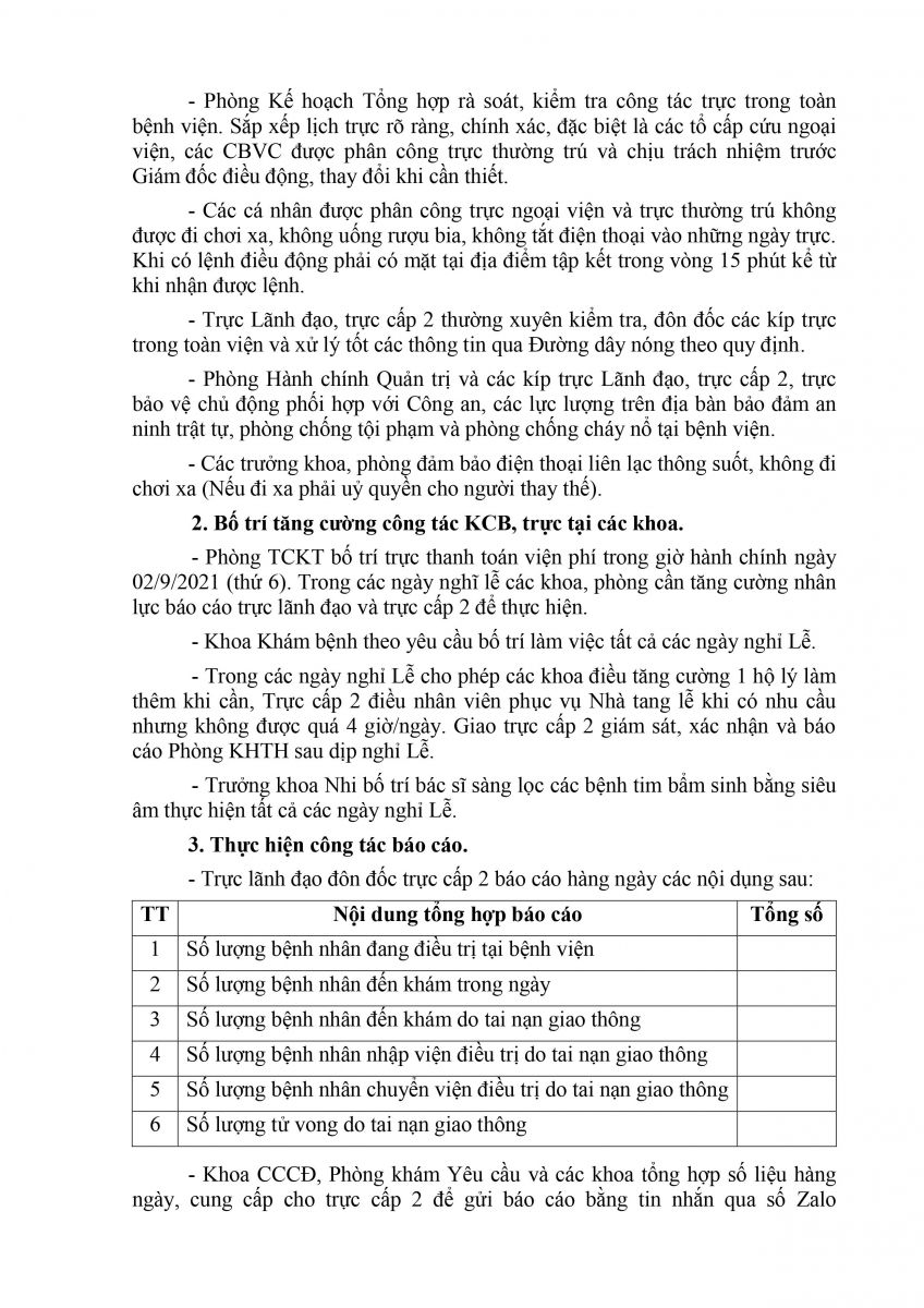 Phòng TCKT bố trí trực thanh toán viện phí trong giờ hành chính ngày 02/9/2021 (thứ 6). Trong các ngày nghĩ lễ các khoa, phòng cần tăng cường nhân lực báo cáo trực lãnh đạo và trực cấp 2 để thực hiện.