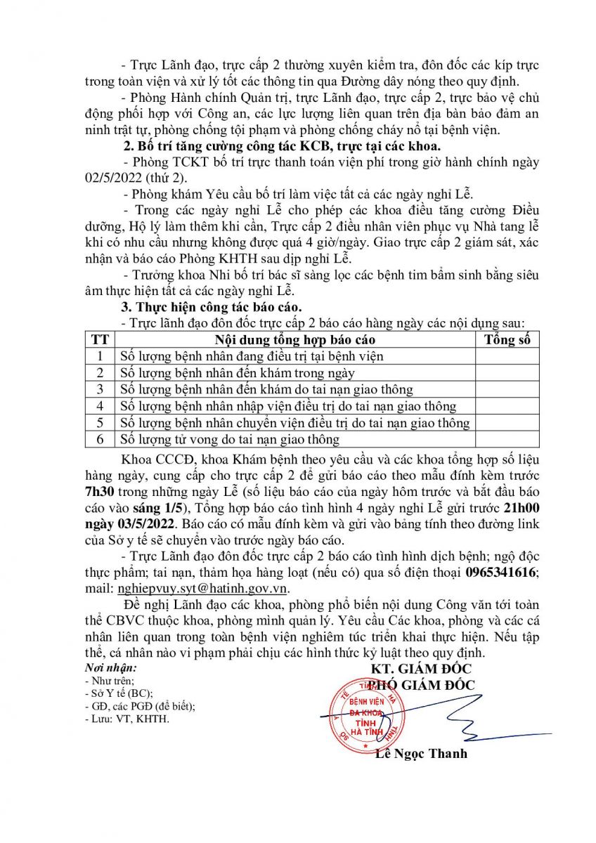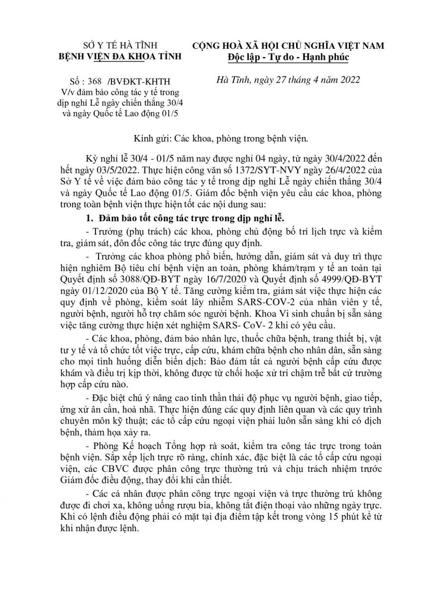 Ngày 27/04 Giám đốc bệnh viện ban hành văn bản số 368/BVĐKT - KHTH yêu cầu các khoa, phòng trong toàn bệnh viện thực hiện tốt các nội dung nhằm đảm bảo tốt công tác trực trong dịp nghỉ lễ, cụ thể như sau: