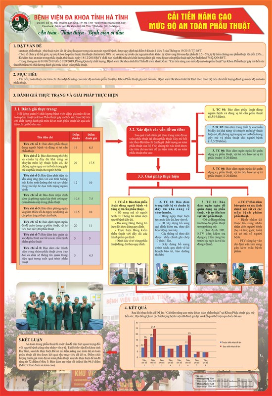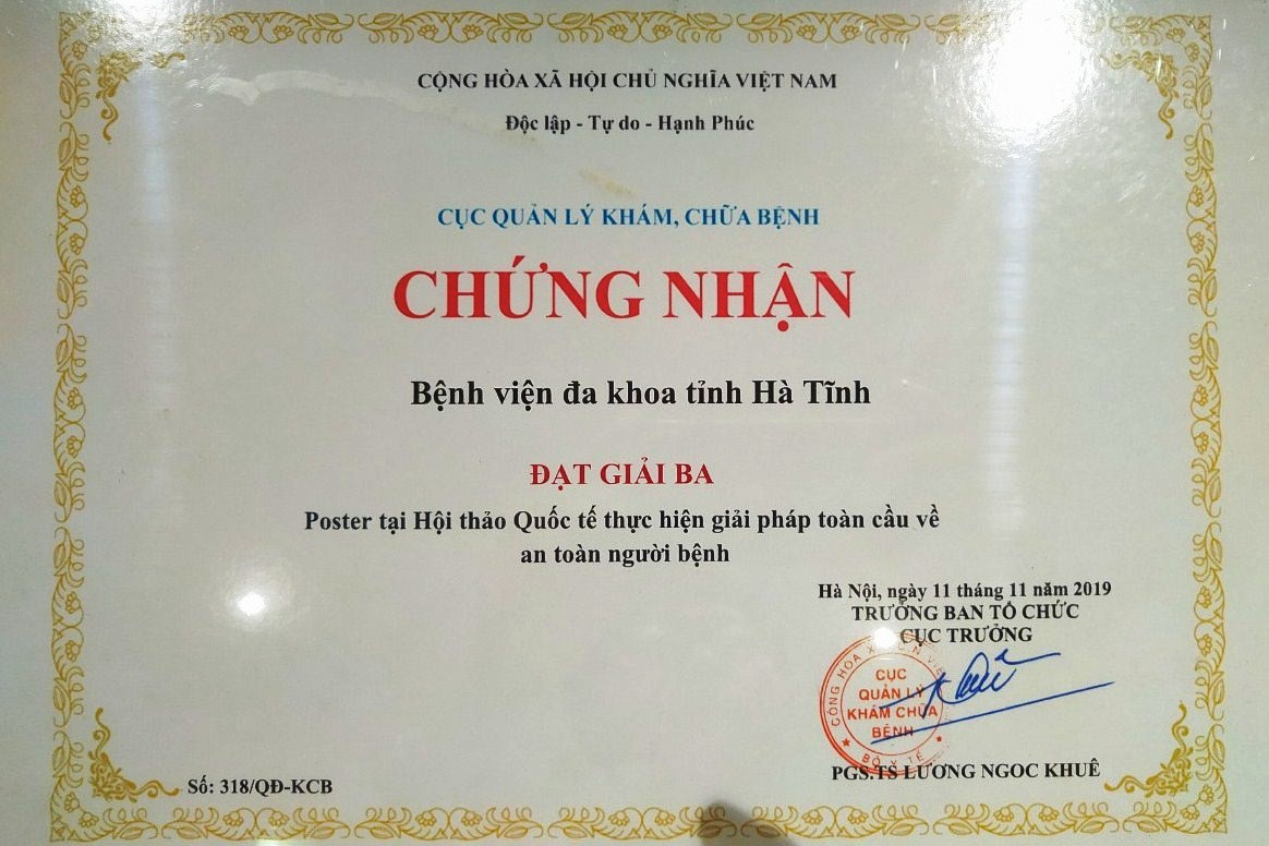 Trong khuôn khổ Hội thảo quốc tế Thực hiện giải pháp toàn cầu về an toàn người bệnh tổ chức tại Hà Nội, Cục Quản lý khám, chữa bệnh (Bộ Y tế) đã lựa chọn 14 poster xuất sắc trong tổng số 176 poster báo cáo thực hiện các giải pháp An toàn người bệnh của các bệnh viện trong toàn quốc báo cáo tại hội thảo. Với nội dung "Cải tiến nâng cao mức độ An toàn phẫu thuật" poster của Bệnh viện Đa khoa tỉnh Hà Tĩnh đã vinh dự đạt giải 3 trong cuộc thi lần này.