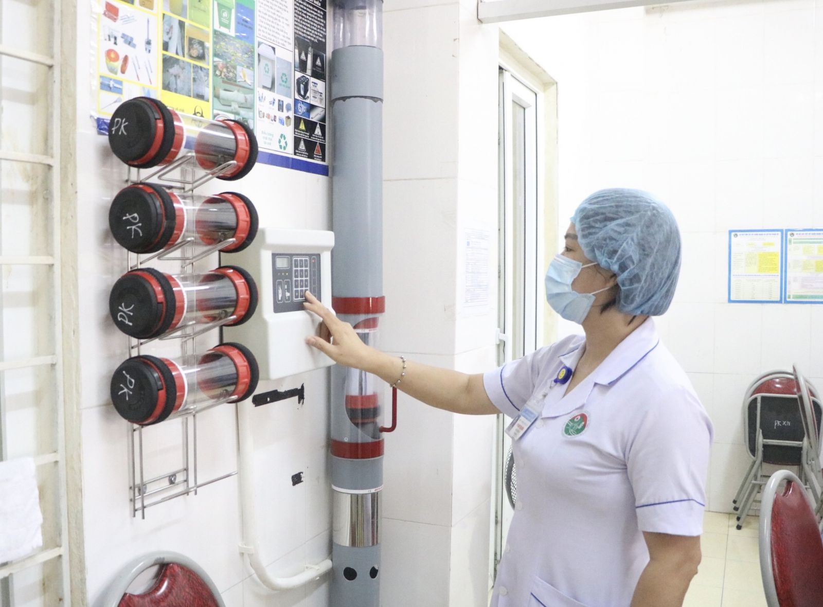 Nhân viên y tế đặt ống đựng bệnh phẩm vào hệ thống vận chuyển