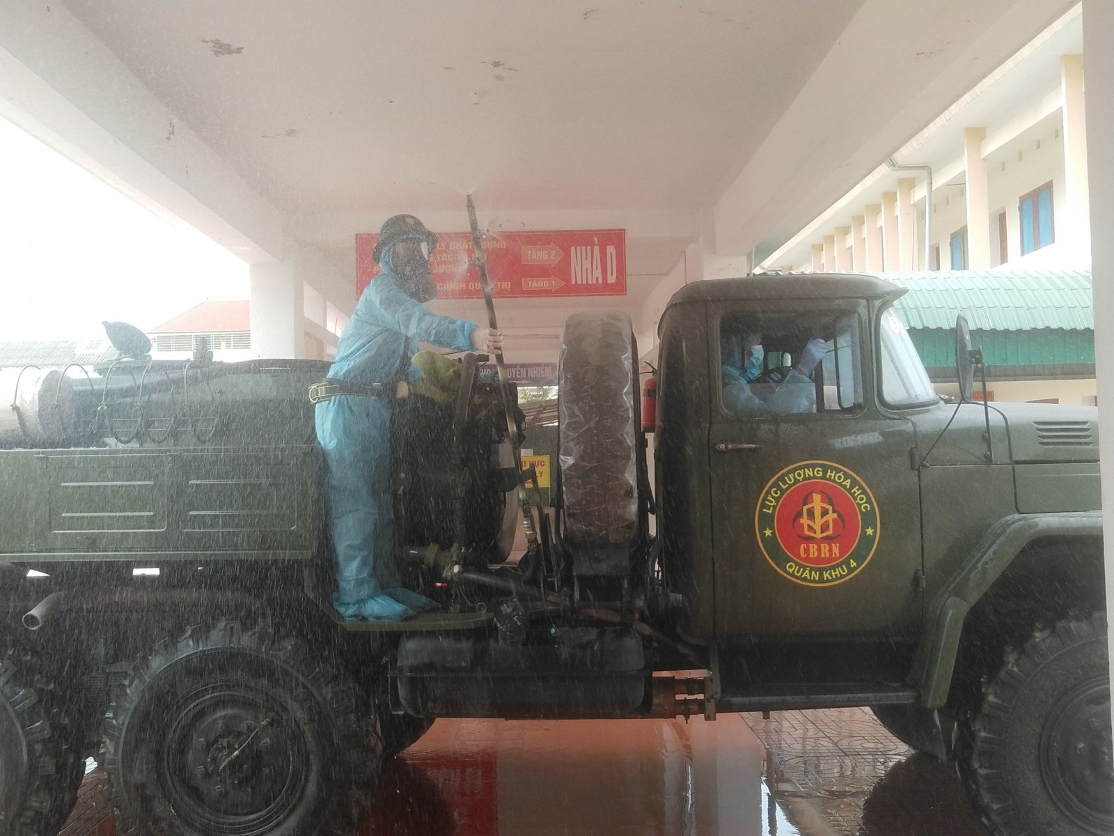 Trước đó, trong sáng 8/6, lực lượng hóa học Quân khu 4 đã điều động xe đặc chủng tiến hành phun khử khuẩn toàn bộ khu vực bệnh viện.