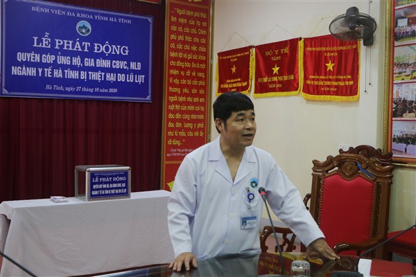 Tại buỗi Lễ phát động đồng chí Hoàng Quang Trung - Giám đốc Bệnh viện mong muốn cán bộ, viên chức bệnh viện với tình cảm, tấm lòng nhân ái và trách nhiệm của mình với cộng đồng, đóng góp ủng hộ cho đồng bào miền trung nói chung và CBCV, NLĐ ngành Y tế Hà Tĩnh nói riêng, nhằm chia sẻ những khó khăn góp phần khắc phục hậu quả do thiên tai, mưa lũ gây ra giúp cán bộ sớm ổn định cuộc sống, tiếp tục hoàn thành tốt công tác chăm sóc sức khỏe nhân dân.