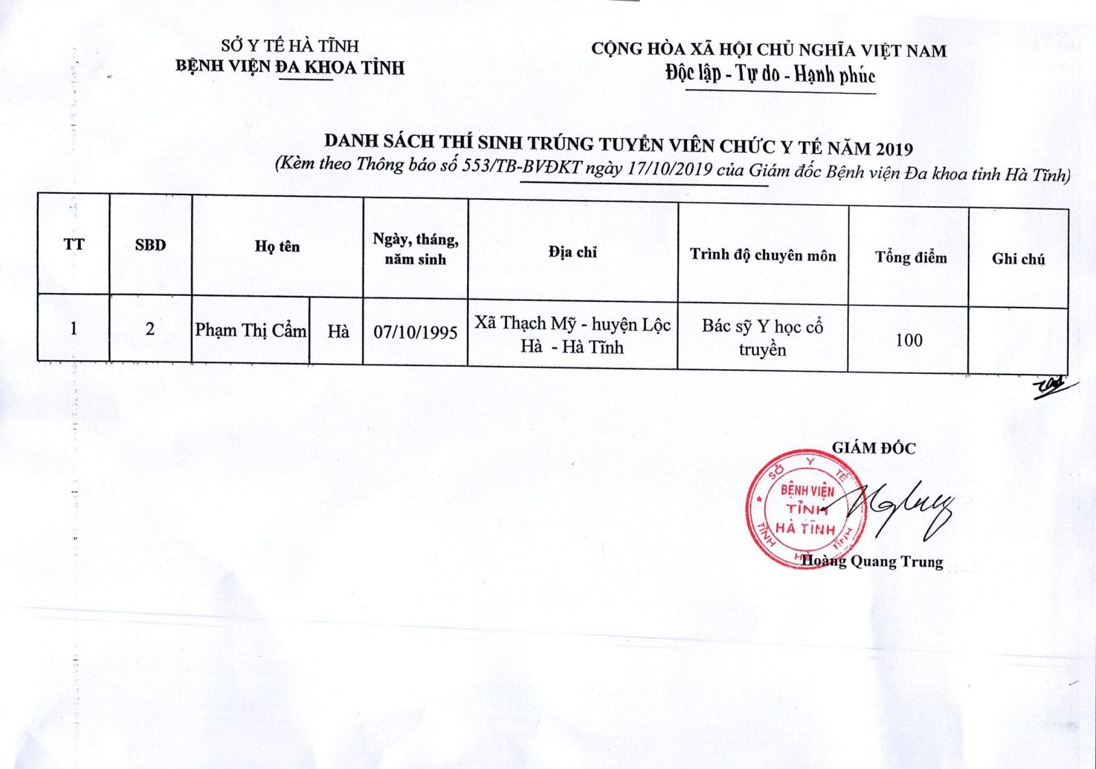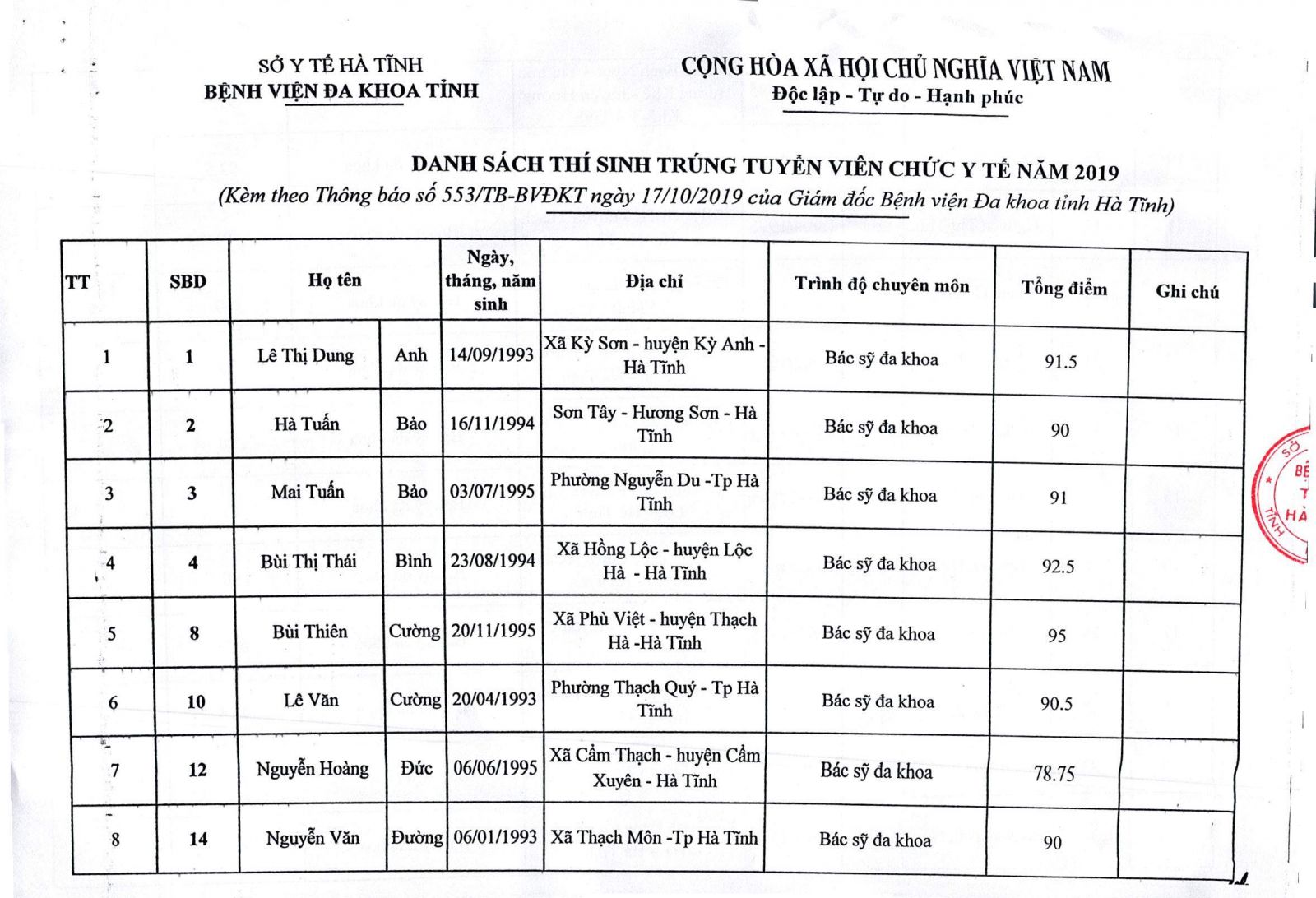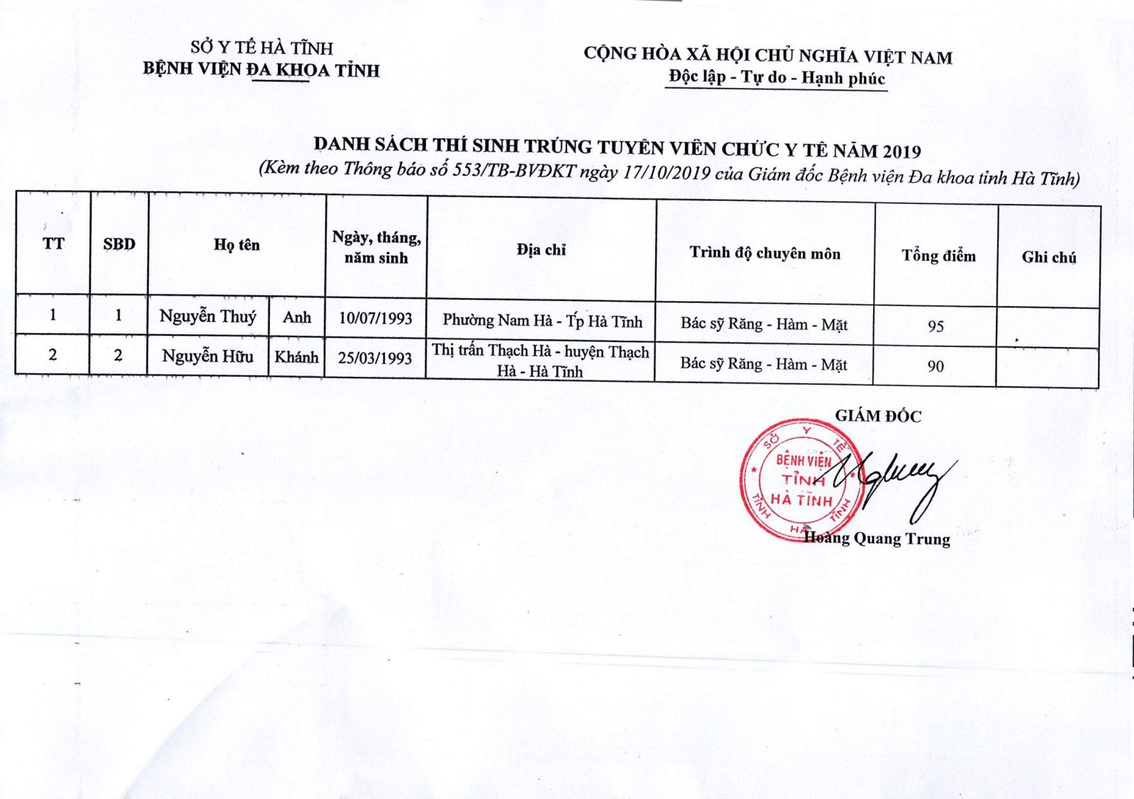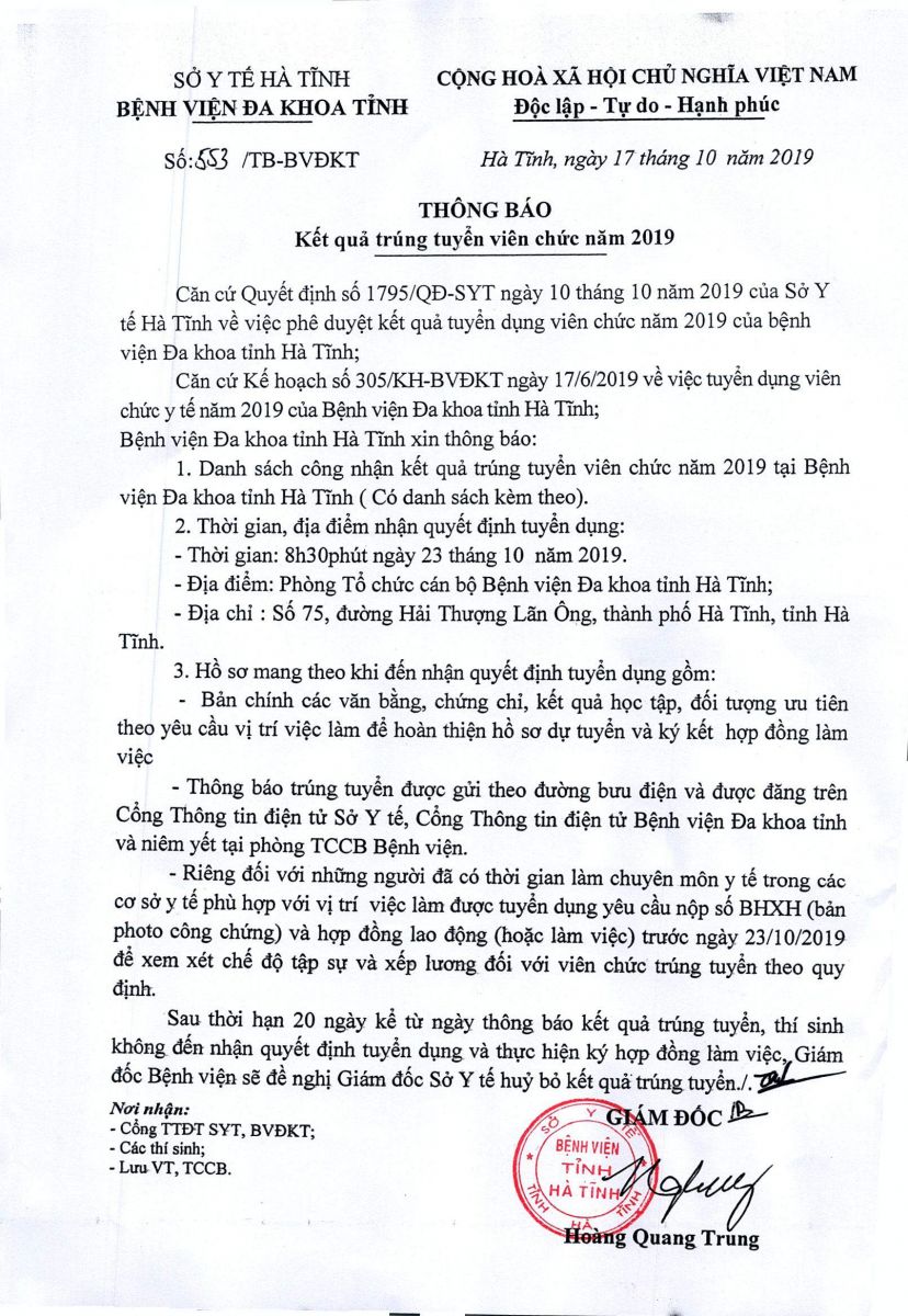 Thực hiện Quyết định số 1795/QĐ-SYT ngày 10/10/2019 của Sở Y tế về việc phê duyệt kết quả tuyển dụng viên chức y tế năm 2019 của Bệnh viện Đa khoa tỉnh Hà Tĩnh, Kế hoạch số 305/KH-BVĐKT ngày 17/6/2019 của Bệnh viện Đa khoa tỉnh về việc tuyển dụng viên chức y tế năm 2019. Bệnh viện Đa khoa tỉnh Hà Tĩnh đã tiến hành các bước xét tuyển theo đúng quy định. Kết quả trúng tuyển viên chức năm 2019 cụ thể như sau:
