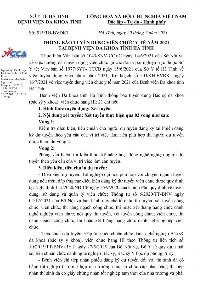 Thực hiện văn bản số 1977/SYT- TCCB ngày 15/6/2021 của Sở Y tế Hà Tĩnh về việc tuyển dụng viên chức năm 2021, Kế hoạch số 503/KH-BVĐKT ngày 16/7/2021 về việc tuyển dụng viên chức y tế năm 2021 của Bệnh viện Đa khoa tỉnh Hà Tĩnh, Bệnh viện Đa khoa tỉnh Hà Tĩnh thông báo tuyển dụng 21 Bác sỹ đa khoa (bác sỹ y khoa), viên chức hạng III.