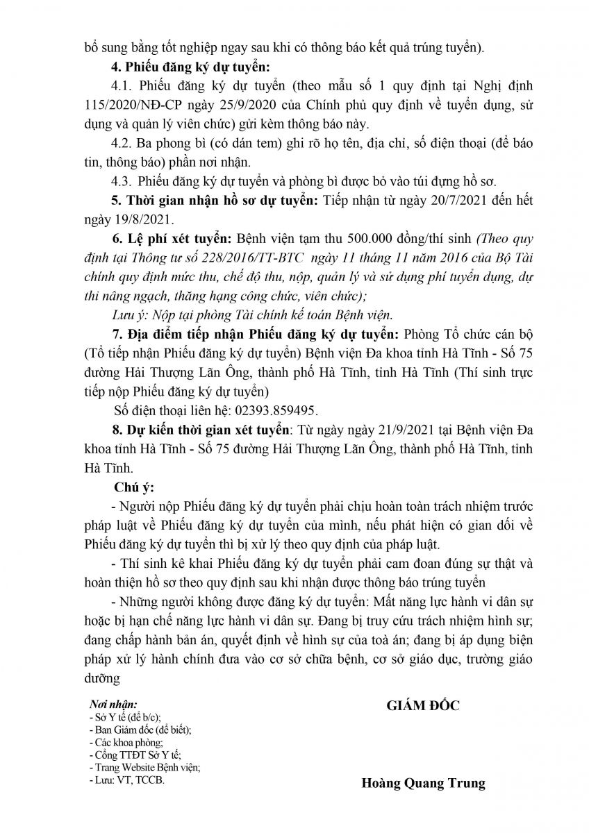 Thực hiện Văn bản số 1043/SNV-CCVC ngày 14/6/2021 của Sở Nội vụ về việc hướng dẫn tuyển dụng viên chức tại các đơn vị sự nghiệp trực thuộc Sở Y tế; Văn bản số 1977/SYT- TCCB ngày 15/6/2021 của Sở Y tế Hà Tĩnh về việc tuyển dụng viên chức năm 2021; Kế hoạch số 503/KH-BVĐKT ngày 16/7/2021 về việc tuyển dụng viên chức y tế năm 2021 của Bệnh viện Đa khoa tỉnh Hà Tĩnh;