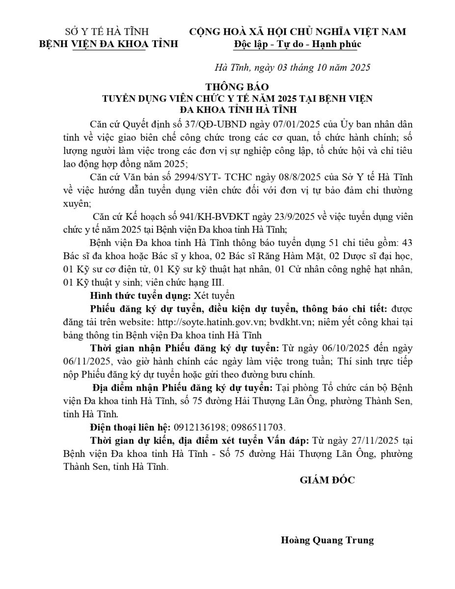 Căn cứ Kế hoạch số 941/KH-BVĐKT ngày 23/9/2025 về việc tuyển dụng viên chức y tế năm 2025 tại Bệnh viện Đa khoa tỉnh Hà Tĩnh;