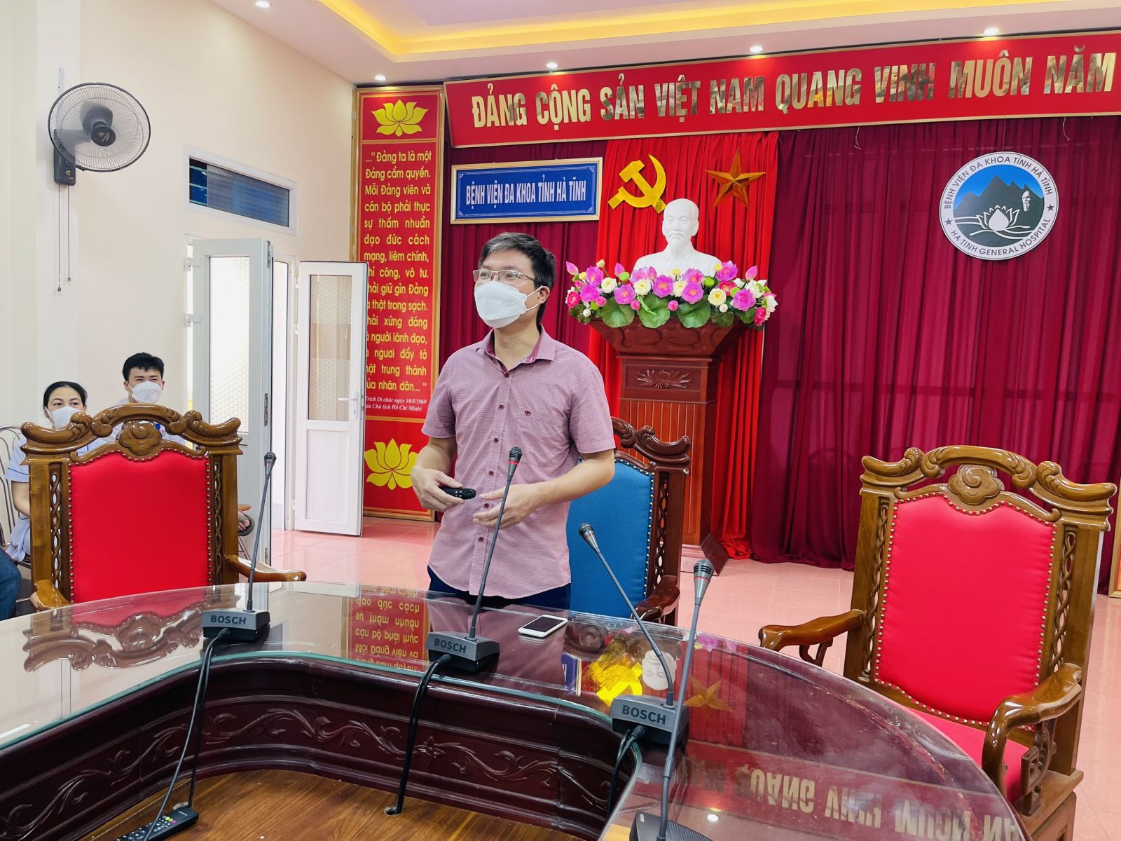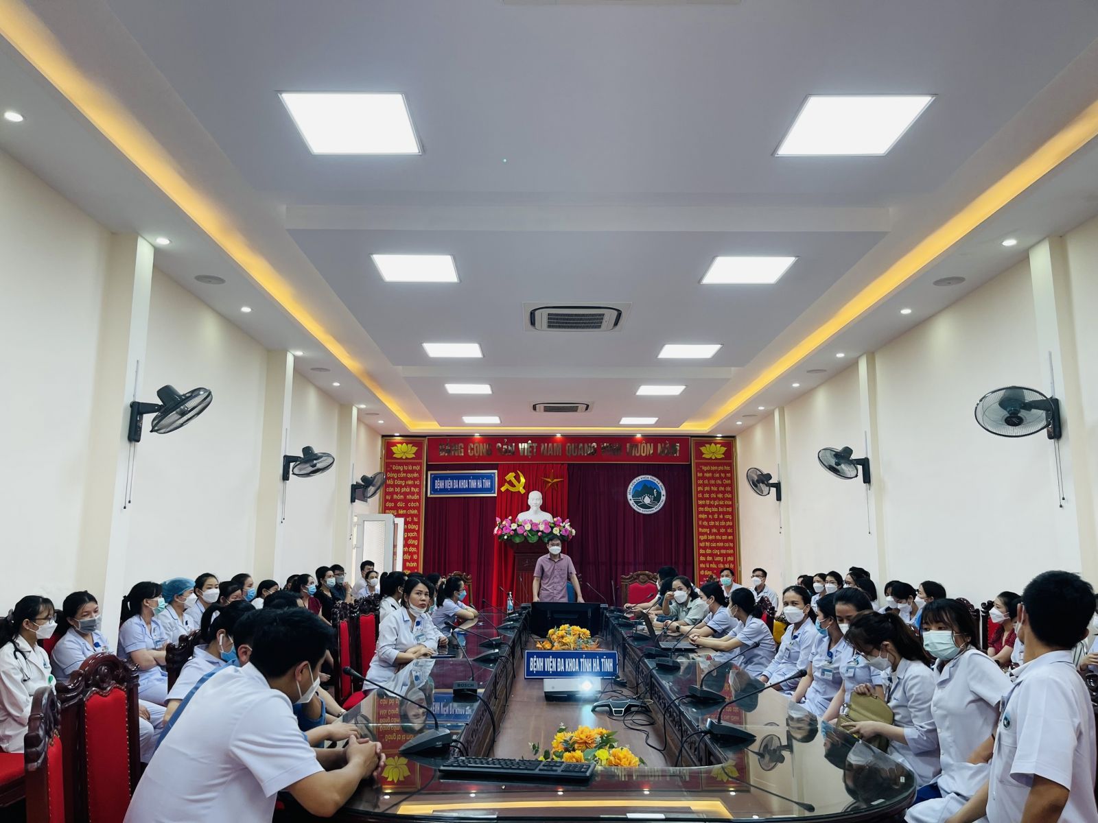 Chiều 13/04/2022 Bệnh viện Đa khoa tỉnh Hà Tĩnh phối hợp với Trung tâm huấn luyện An toàn vệ sinh lao động - Trường trung cấp nghề Hà Tĩnh tổ chức lớp tập huấn An toàn vệ sinh lao động tại bệnh viện.