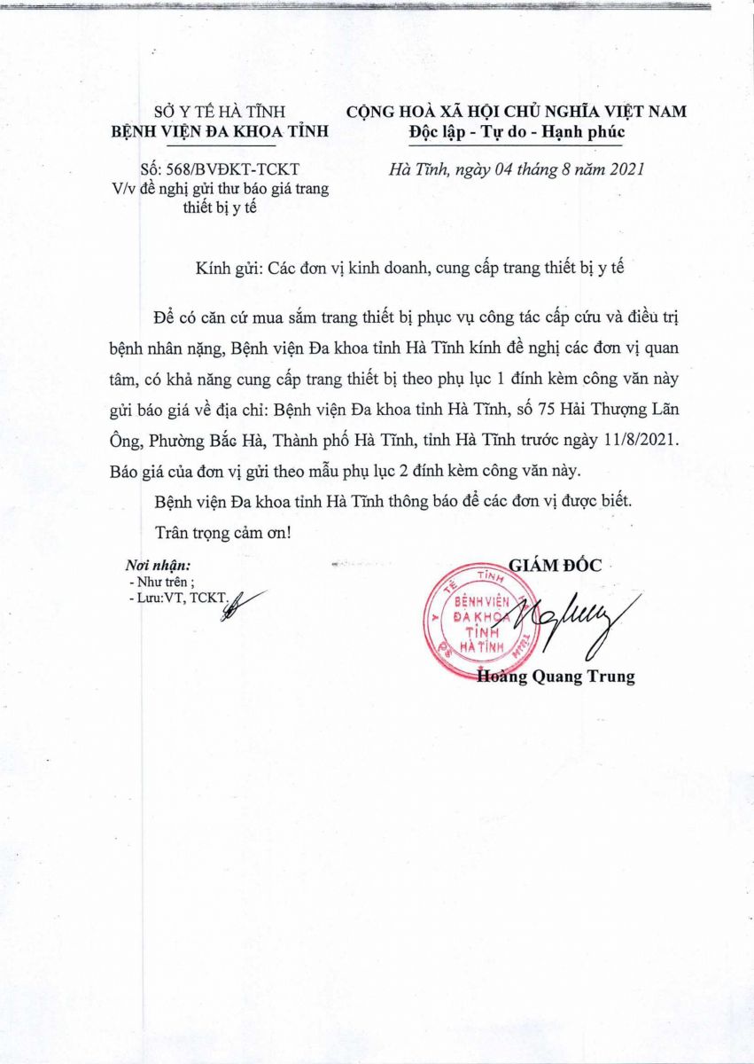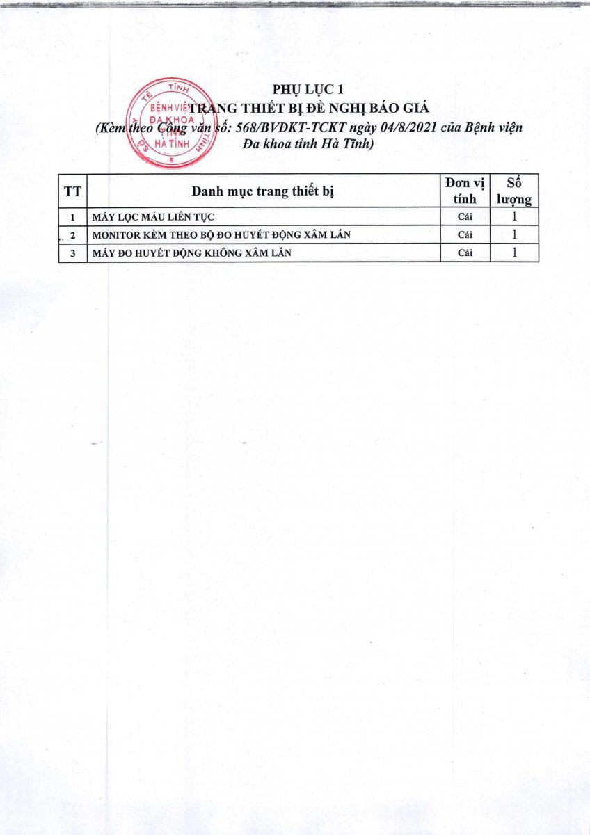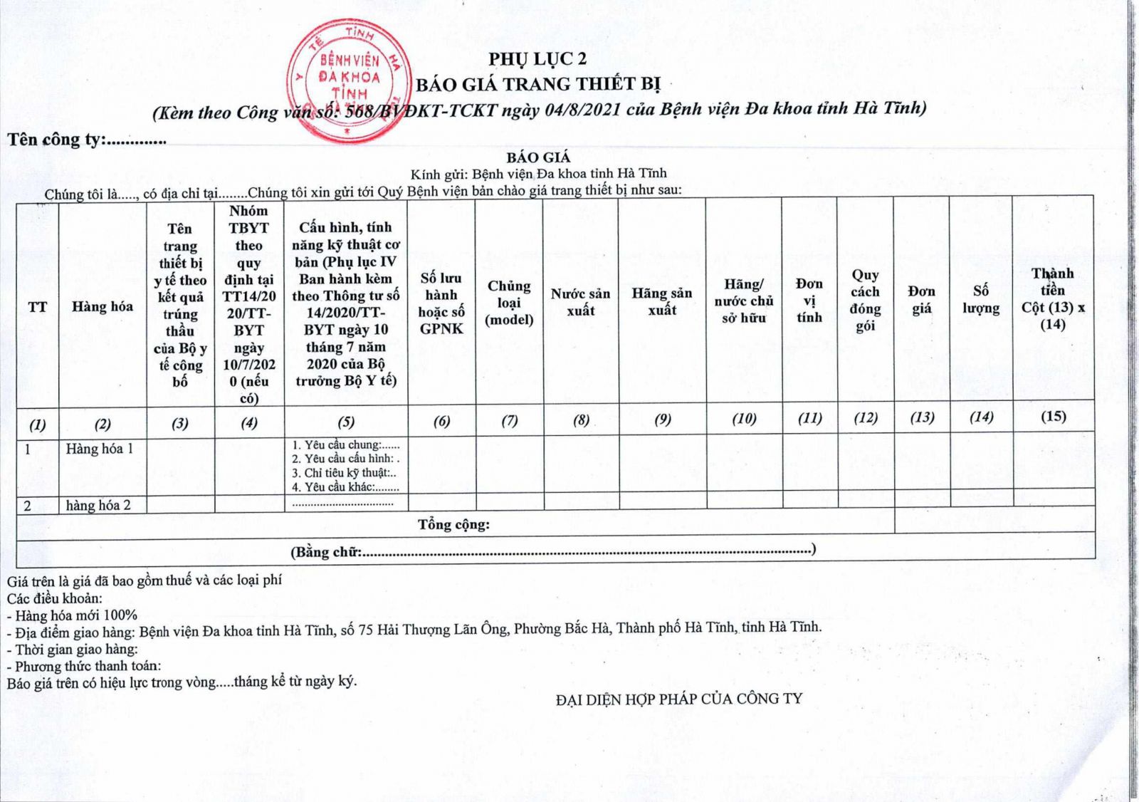 Kính đề nghị các đơn vị quan tâm, có khả năng cung cấp trang thiết bị theo danh sách gửi báo giá về địa chỉ: Bệnh viện Đa khoa tỉnh Hà Tĩnh, Số 75, đường Hải Thượng Lãn Ông, phường Bắc Hà, thành phố Hà Tĩnh, tỉnh Hà Tĩnh trước ngày 11/8/2021.