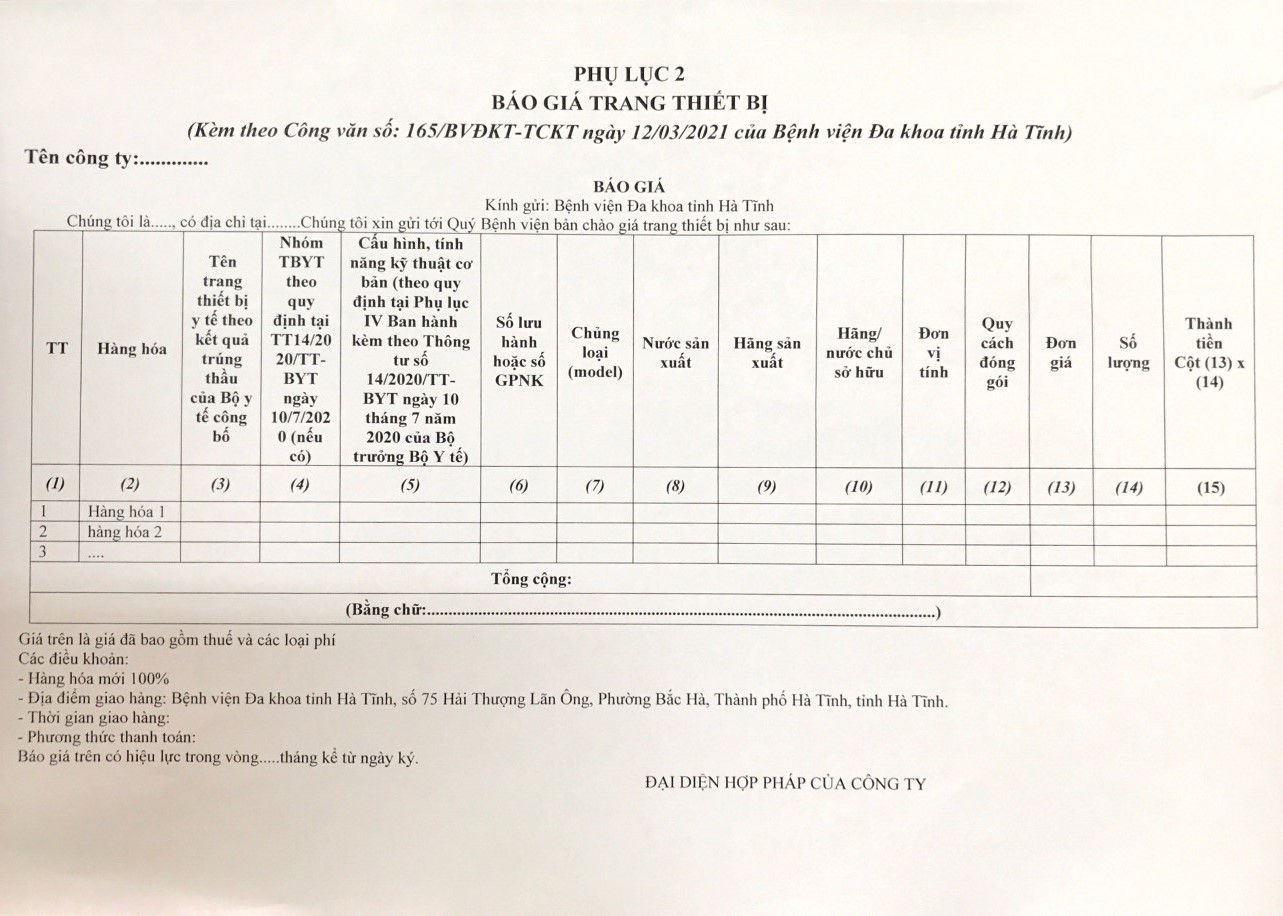 Kính đề nghị các đơn vị quan tâm, có khả năng cung cấp trang thiết bị theo danh sách gửi báo giá về địa chỉ: Bệnh viện Đa khoa tỉnh Hà Tĩnh, Số 75, đường Hải Thượng Lãn Ông, phường Bắc Hà, thành phố Hà Tĩnh, tỉnh Hà Tĩnh trước ngày 18/03/2021.