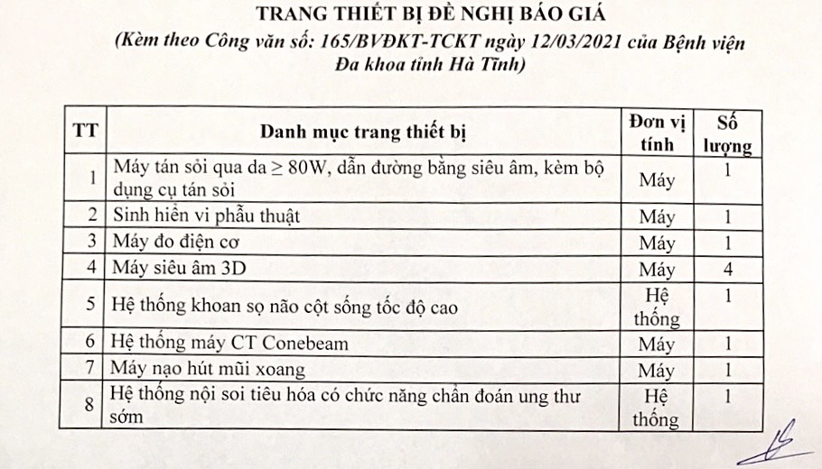 Để có căn cứ mua sắm các trang thiết bị y tế thuộc Đề án tăng cường cơ sở vật chất năm 2021, Bệnh viện Đa khoa tỉnh Hà Tĩnh kính đề nghị các đơn vị quan tâm, có khả năng cung cấp trang thiết bị gửi đề nghị báo giá về cho bệnh viện.