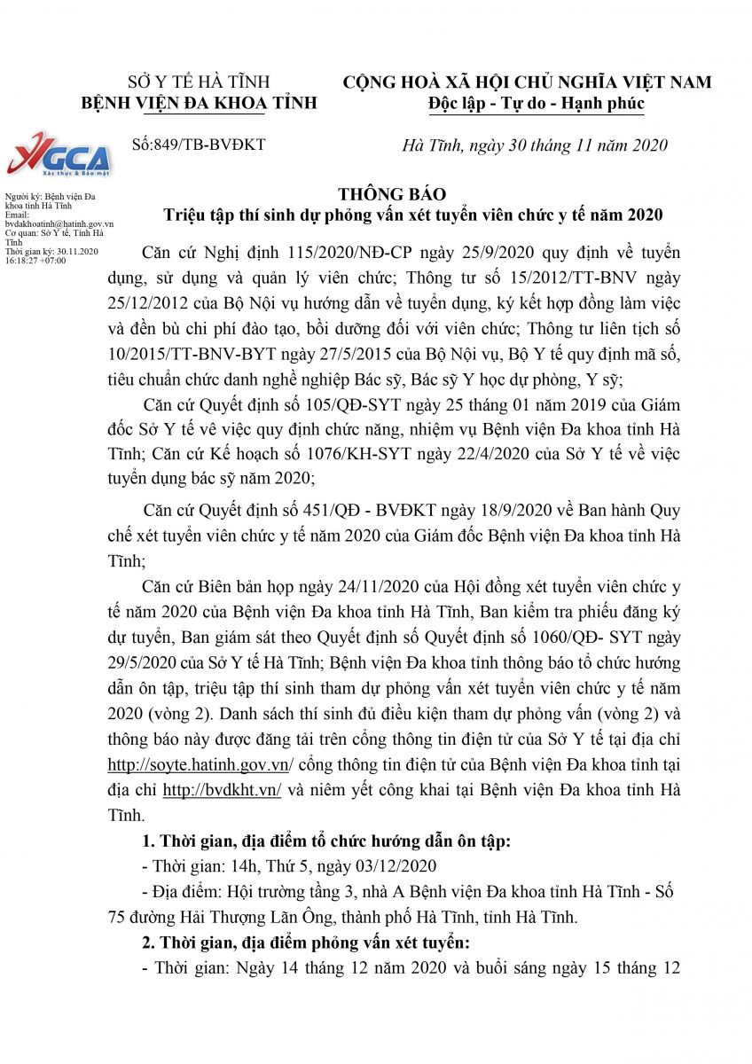 Hội đồng xét tuyển viên chức y tế năm 2020, Bệnh viện Đa khoa tỉnh thông báo triệu tập thí sinh dự phỏng vấn xét tuyển viên chức y tế năm 2020. Kế hoạch cụ thể như sau: