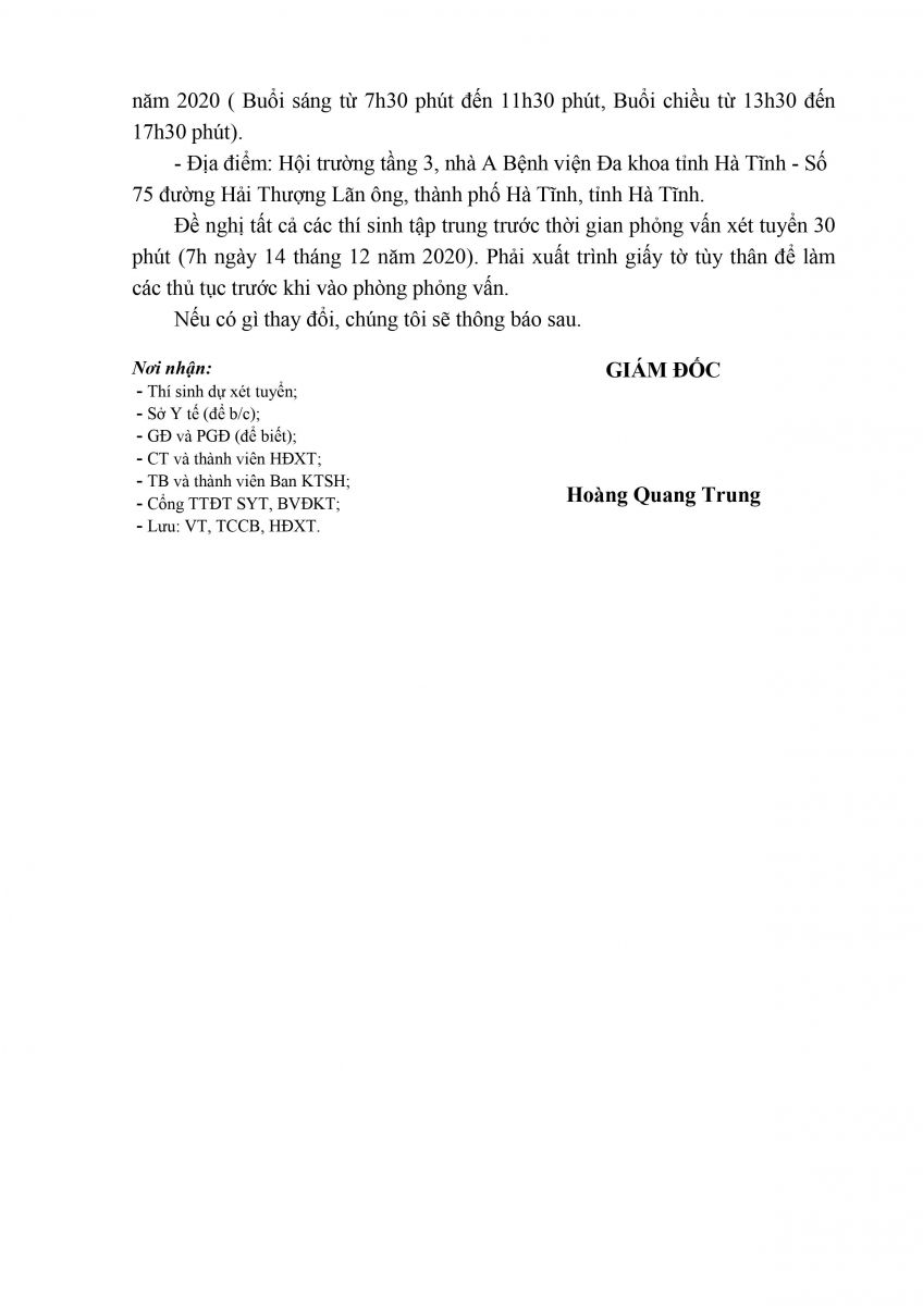 Hội đồng xét tuyển viên chức y tế năm 2020, Bệnh viện Đa khoa tỉnh thông báo triệu tập thí sinh dự phỏng vấn xét tuyển viên chức y tế năm 2020.