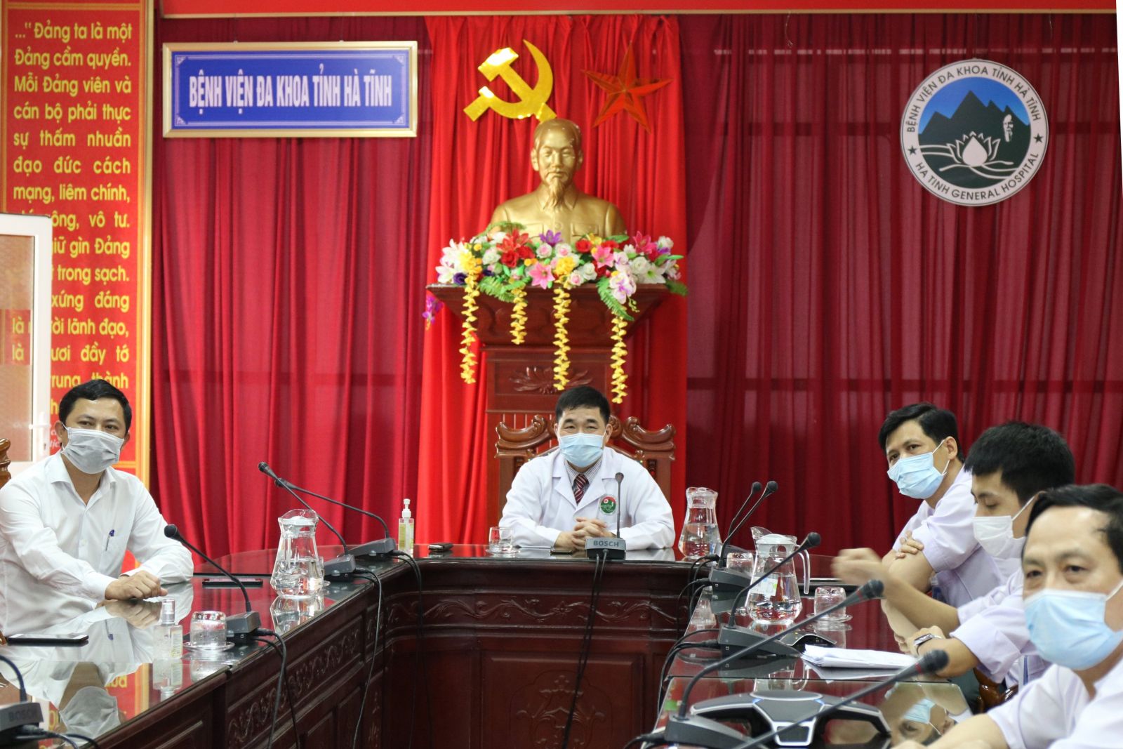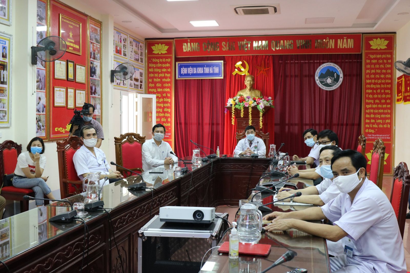 Đồng chí Lê Ngọc Châu, Giám đốc Sở Y tế Hà Tĩnh, Đồng chí Hoàng Quang Trung Giám đốc Bệnh viện Đa khoa tỉnh Hà Tĩnh cùng các đồng chí trong Ban giám đốc bệnh viện và các bác sĩ liên quan tham gia vào buổi hội chẩn trực tuyến giữa hai bệnh viện