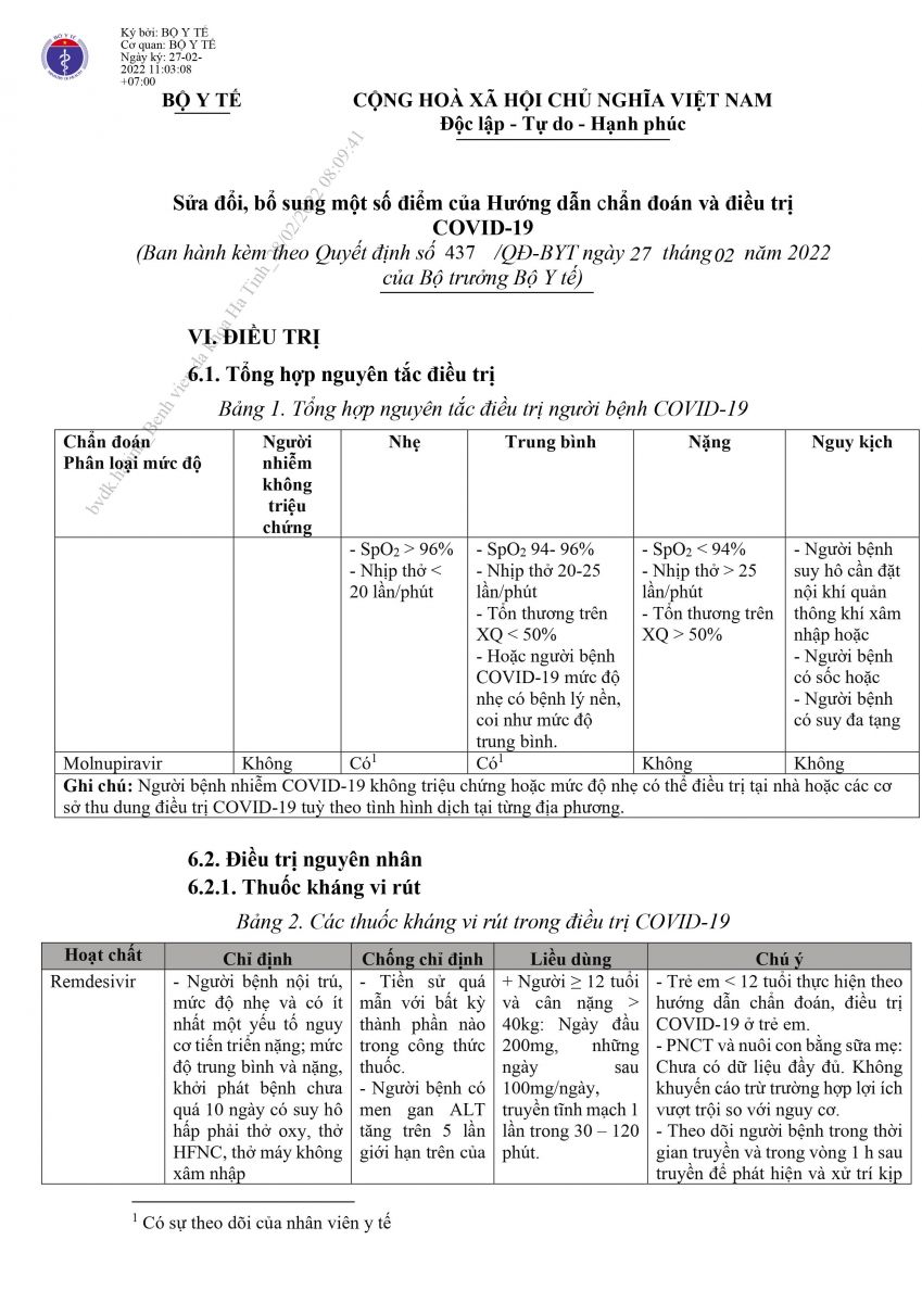 Bộ Y tế vừa ban hành quyết định số 437/QĐ-BYT ngày 27/02/2022 về việc sửa đổi, bổ sung một số điểm của Hướng dẫn chẩn đoán và điều trị COVID-19.