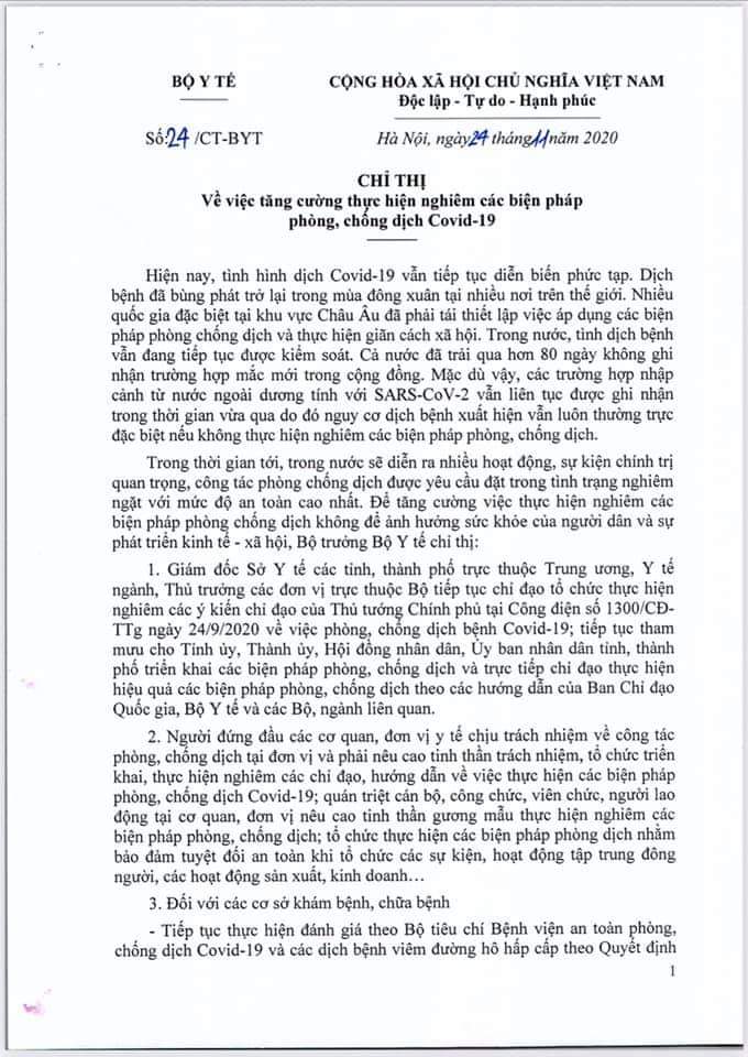 Hiện nay, tình hình dịch Covid - 19 vấn tiếp tục diễn biến phức tạp. Dịch bệnh đã bùng phát trở lại trong mùa đông xuân tại nhiều nơi trên thế giới. Nhiều quốc gia đặc biệt là tại khu vực Châu ÂU đã phải tía thiệt lập việc áp dụng các biện pháp phòng chống dịch và thực hiện giãn cách xã hội. Trong nước, tình hình dịch bệnh vẫn đang tiếp tục được kiểm soát. Trong thời gian tới, trong nước sẽ diễn ra nhiều hoạt động, sự kiện chính trị quan trọng, công tác phòng chống dịch được yêu cầu đặt trong tình trạng nghiêm ngặt với mức độ an toàn cao nhất. Để tăng cường việc thực hiện nghiêm các biện pháp phòng chống dịch không để ảnh hưởng sức khỏe của người dân và sự phát triển kinh tế - xã hội, Bộ Y tế ban hành chỉ thị số 24/CT-BYT ngày 24/11/2020 về việc tăng cường thực hiện nghiêm các biện pháp phòng, chống dịch Covid - 19.