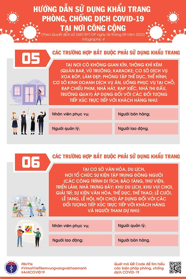 Tại cơ sở văn hóa, du lịch, những nơi tổ chức sự kiện tập trung đông người, áp dụng với nhân viên phục vụ, quản lý, người lao động, người bán hàng khi tiếp xúc với khách hàng và người tham dự.