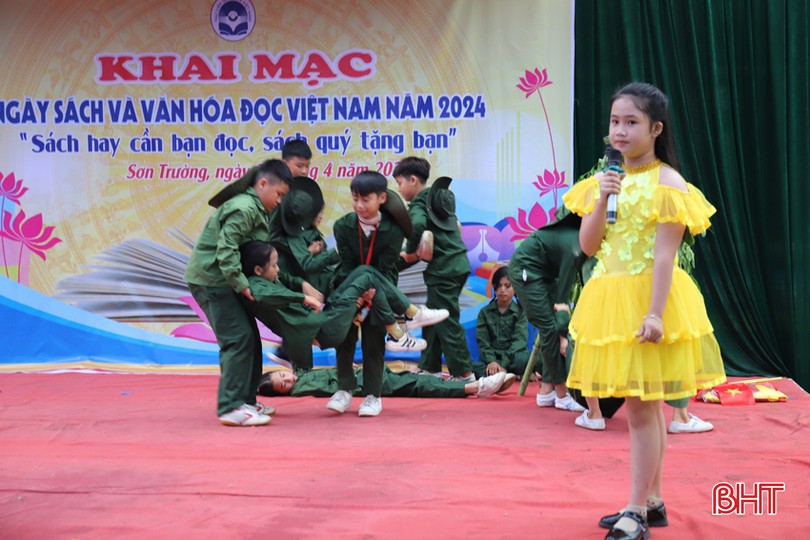 Bên cạnh đó là các tiết mục văn nghệ, kể chuyện theo sách bằng hình thức sân khấu hóa; hoạt động rung chuông vàng được các em học sinh tham gia tích cực, hứng khởi. (Trong ảnh: Học sinh Trường Tiểu học Sơn Trường kể chuyện Đồng Lộc ơi 10 bông hoa bất tử).