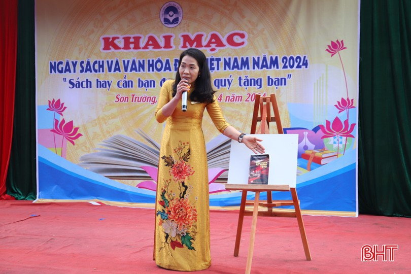 Qua Ngày Sách và văn hóa đọc năm 2024, các em được tham gia giao lưu, giới thiệu những cuốn sách hay, bổ ích, phù hợp với lứa tuổi, tạo không gian văn hóa vui tươi, lành mạnh, khích lệ tinh thần đam mê đọc sách ở học sinh, góp phần nâng cao chất lượng dạy, học trong nhà trường. (Trong ảnh: Giáo viên Trường Tiểu học Sơn Trường giới thiệu sách hay Đại thắng mùa xuân 1975).