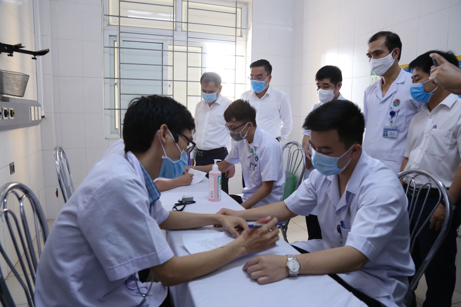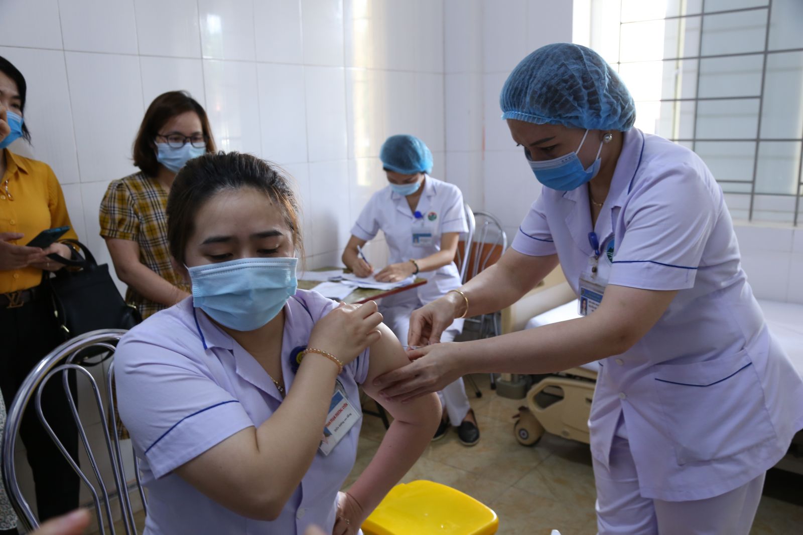 Ngay sau khi thực hiện công tác hướng dẫn, sàng lọc trước tiêm, BVĐK tỉnh tiến hành tiêm mũi vắc-xin đầu tiên cho bác sỹ Hoàng Việt Hà dưới sự theo dõi, giám sát của Sở Y tế và các BVĐK tuyến huyện.