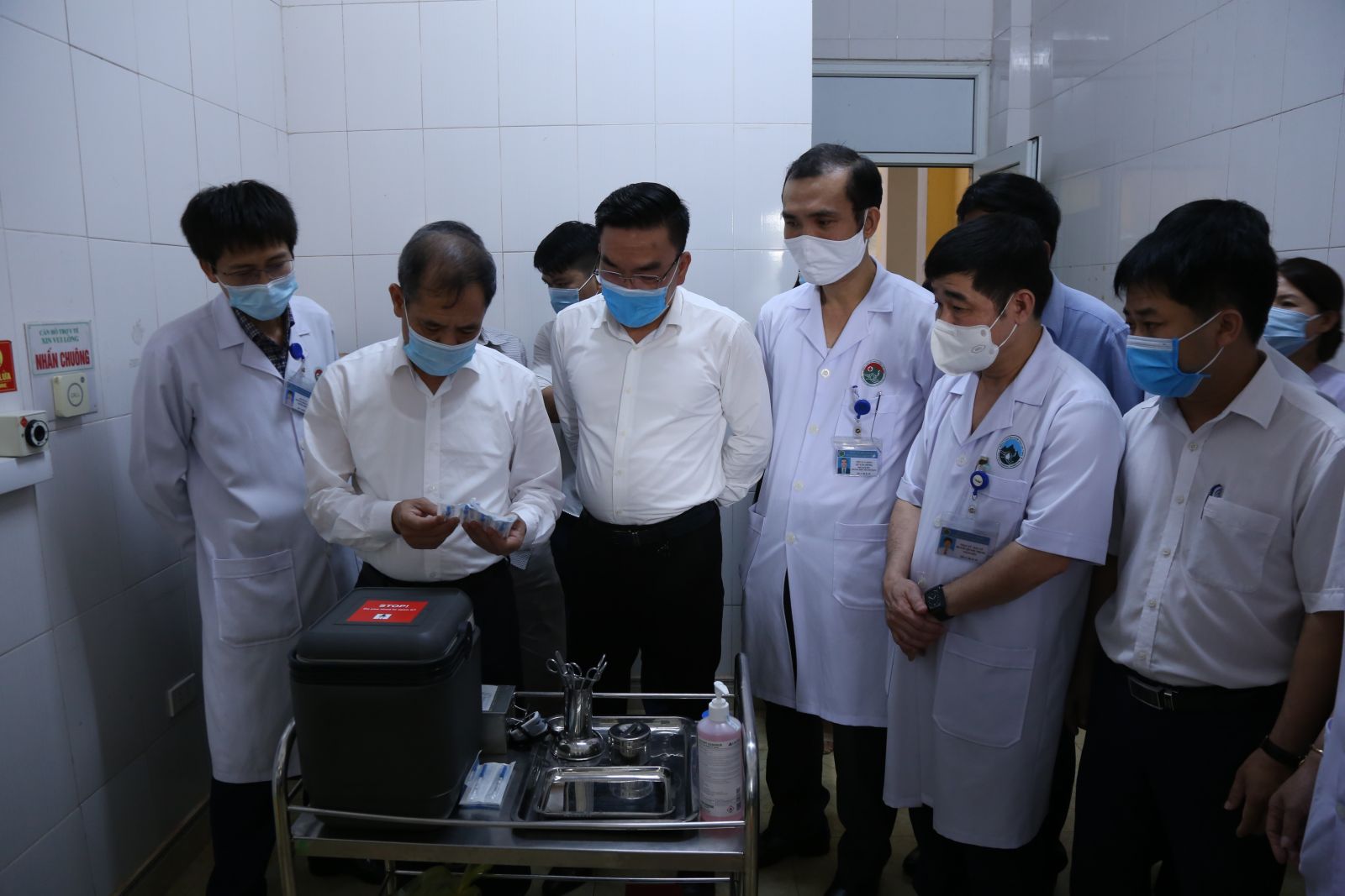 Để chuẩn bị cho đợt tiêm này, BVĐK tỉnh đã chuẩn bị chu đáo, kỹ lưỡng các điều kiện từ khu vực tiếp đón, phòng sàng lọc trước tiêm, phòng tiêm, phòng theo dõi sau tiêm (Trong ảnh: Lãnh đạo Sở Y tế kiểm tra các phòng tiêm vắc-xin trước khi tổ chức tiêm).