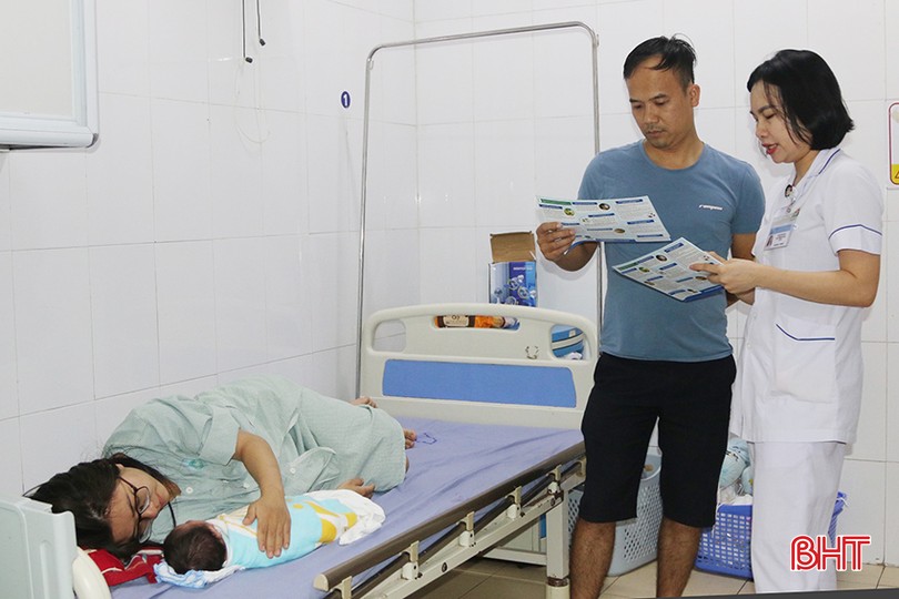 Nhân viên y tế tại Bệnh viện Đa khoa tỉnh Hà Tĩnh tuyên truyền về lợi ích của sàng lọc sơ sinh tới gia đình sản phụ.