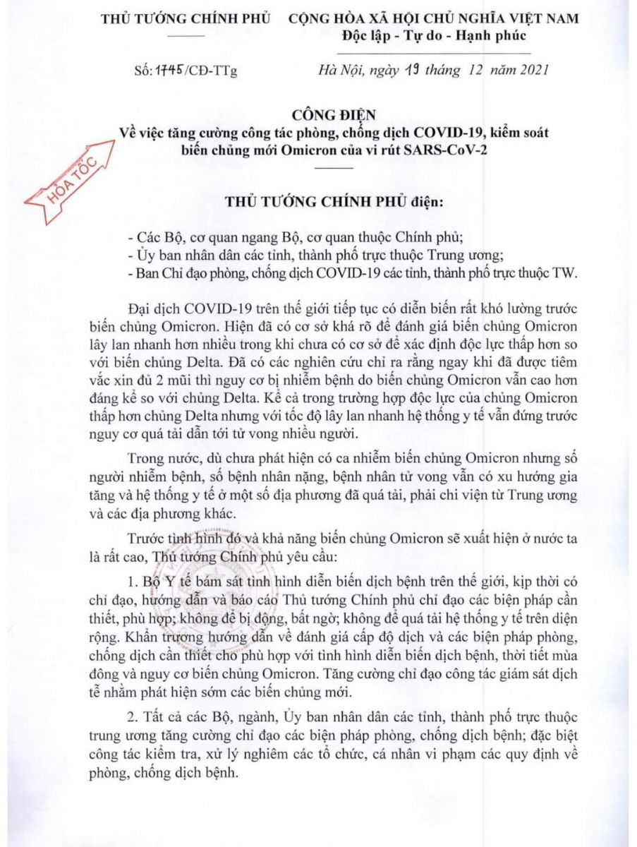 Công điện của Thủ tướng Chính phủ về tăng cường phòng, chống dịch COVID-19, kiểm soát biến chủng mới Omicron