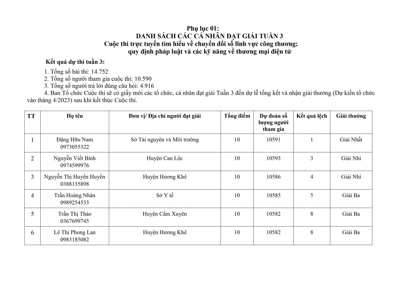 Ban Tổ chức Cuộc thi sẽ có giấy mời các tổ chức, cá nhân đạt giải Tuần 3 đến dự lễ tổng kết và nhận giải thưởng (Dự kiến tổ chức vào tháng 4/2023) sau khi kết thúc Cuộc thi.