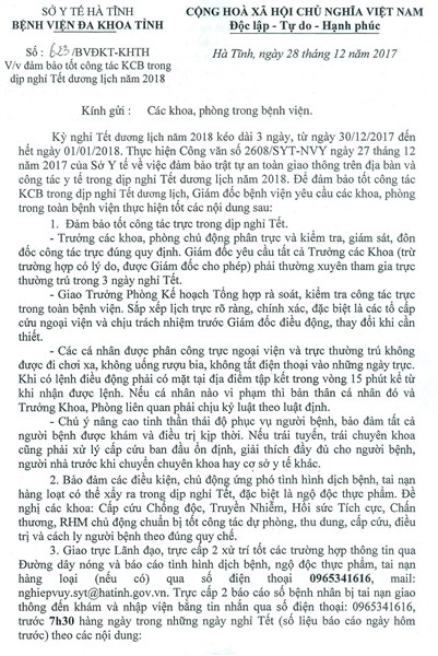 Kỳ nghỉ tết dương lịch năm nay kéo dài trong 03 ngày, để đảm bảo tốt công tác khám, chữa bệnh trong dịp này, Giám đốc bệnh viện vừa có văn bản yêu cầu các Khoa, Phòng, Ban và cán bộ viên chức thực hiện tốt một số vấn đề sau